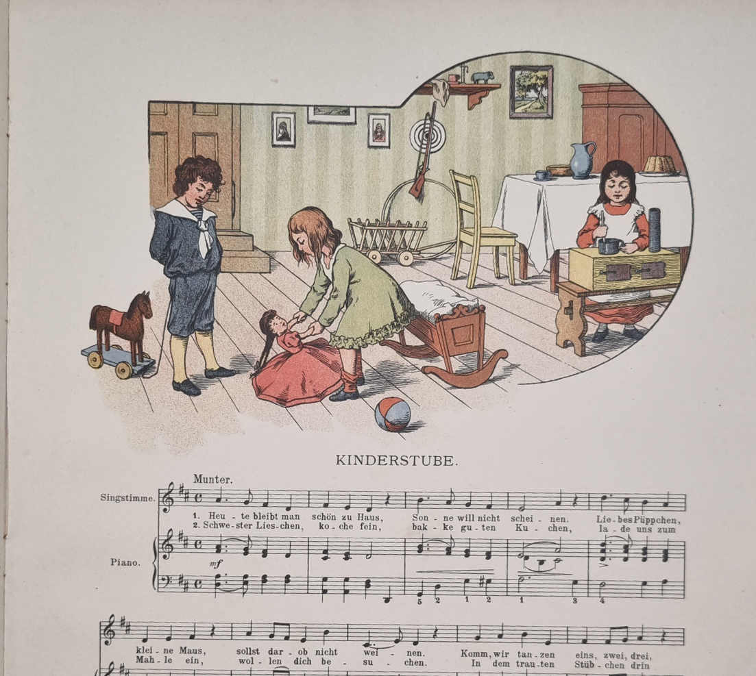 Pestalozzi, Heinrich: Das Kind in Lied und Bild. Worte und Musik von Heinrich Pestalozzi. Berlin, Otto Wernthal, um 1910. Ca. 33,5 x 27 cm. 54 S., (2) Seiten. Mit Noten und zahlreichen, teils farbigen Illustrationen von Richard Nitsch. Farbig illustr. Orig.-Halbleinenband. Ries 747,2. Einbandkanten berieben, zwei Blätter mit kleineren Randeinrissen. „Es sind also nicht eigentliche Kinderlieder, an denen bekanntlich kein Mangel ist, sondern Lieder über das Kind. Deshalb möge dieses Büchlein nicht allein den Kleinen lieb werden, auch den Erwachsenen, welche für sie Verständnis haben und in ihrem Fühlen und Denken aufgehen.“ (Vorwort). Aus dem Inhalt u.a.: Schneeglöckchen, Frau Schwalbe, Ostern, Soldatenleben, Kinderstube, Der erste Schnee, Mitleid, Weihnachten. Hübsch illustriertes Kinderbuch.