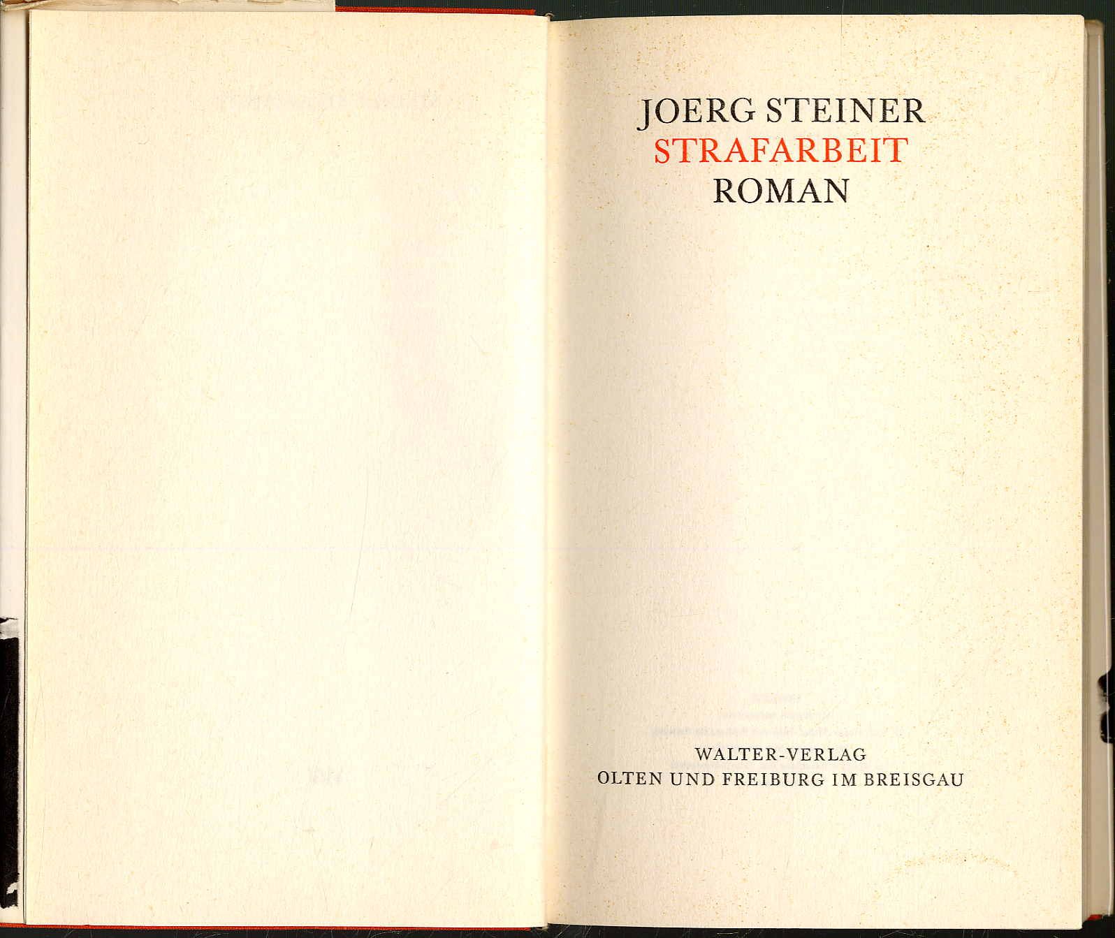 Steiner, Joerg: Strafarbeit. Roman. Olten und Freiburg, Walter-Verlag, 1962. Ca. 20,5 x 12,5 cm. 171 Seiten. Roter Orig.-Leinenband mit Schutzumschlag. Erste Ausgabe des ersten Romans. Vorsatz mit eigenhändiger Widmung und Unterschrift von Steiner (1930-2013, Schriftsteller), datiert 13. Nov. 99. Sehr gutes Exemplar.