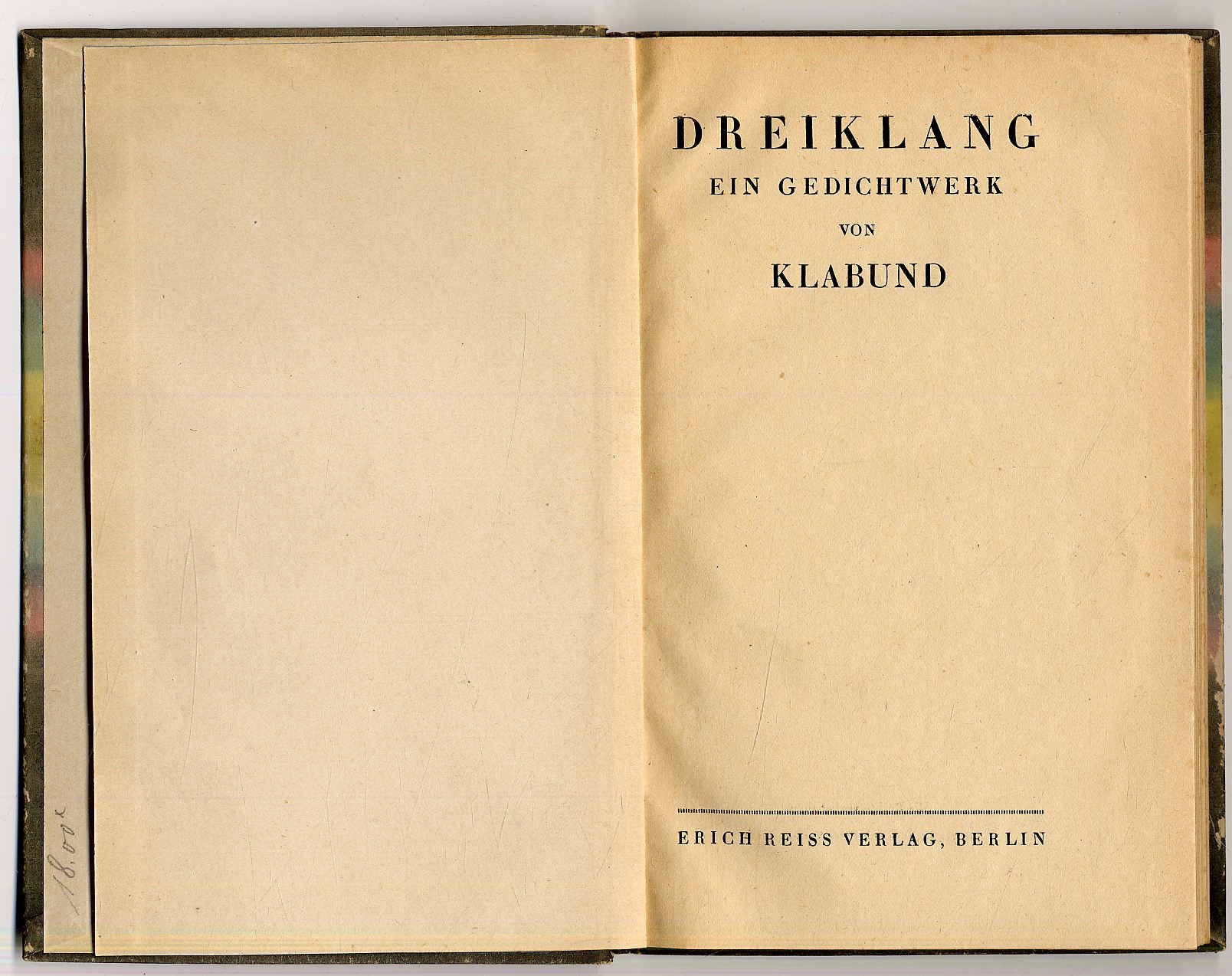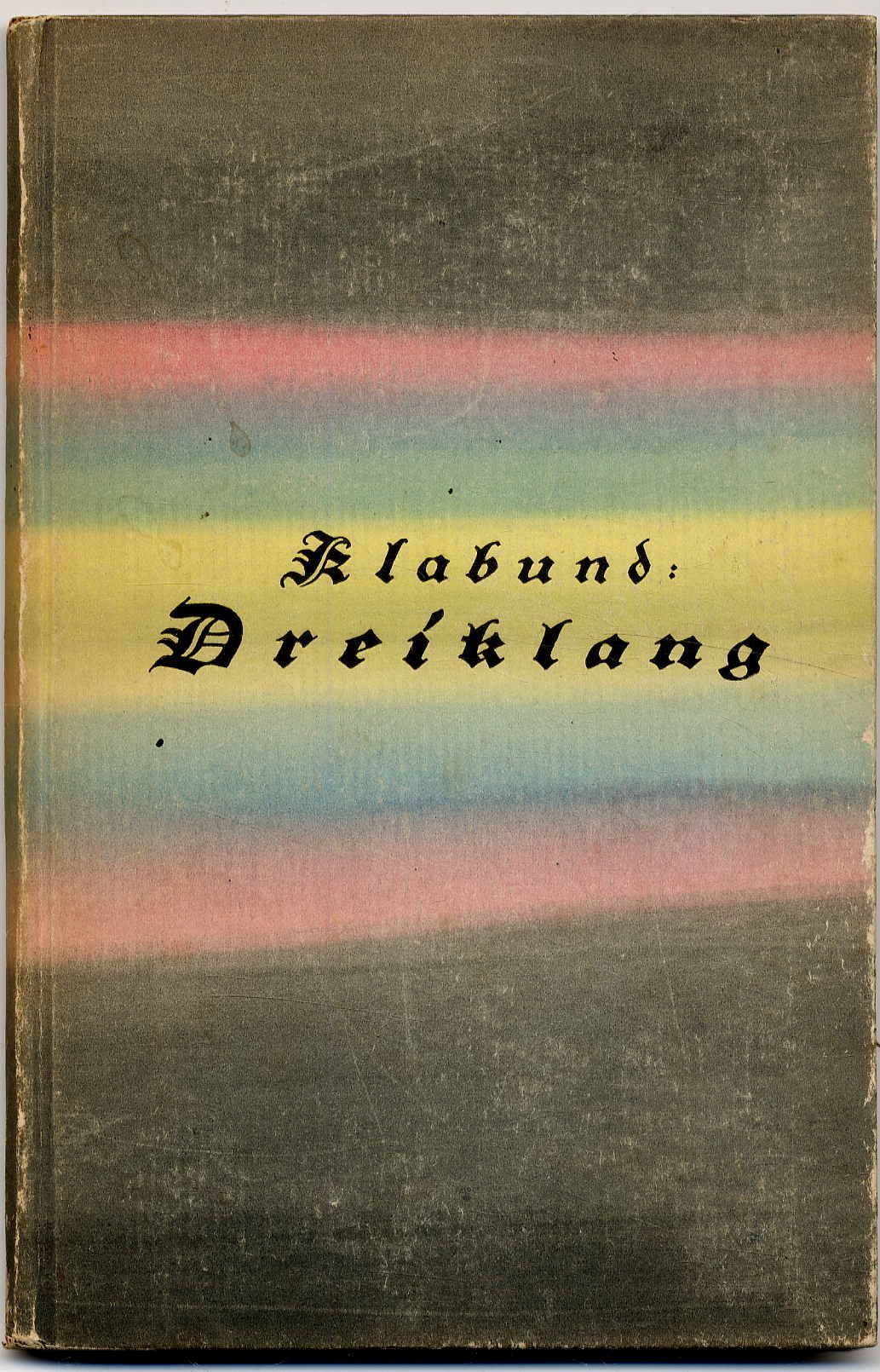 Klabund [d.i. Alfred Henschke]: Dreiklang. Ein Gedichtwerk. Berlin, Erich Reiss Verlag, 1919. Ca. 20,5 x 13,5 cm. 105 S., (5) Seiten. Farbig illustr. Orig.-Pappband. Erstausgabe. WG 33 (gibt als Erscheinungsjahr 1920 an). Einbandkanten etwas berieben. Druckvermerk: „Gedruckt im Herbst 1919 bei Mänicke & Jahn in Rudolstadt2.