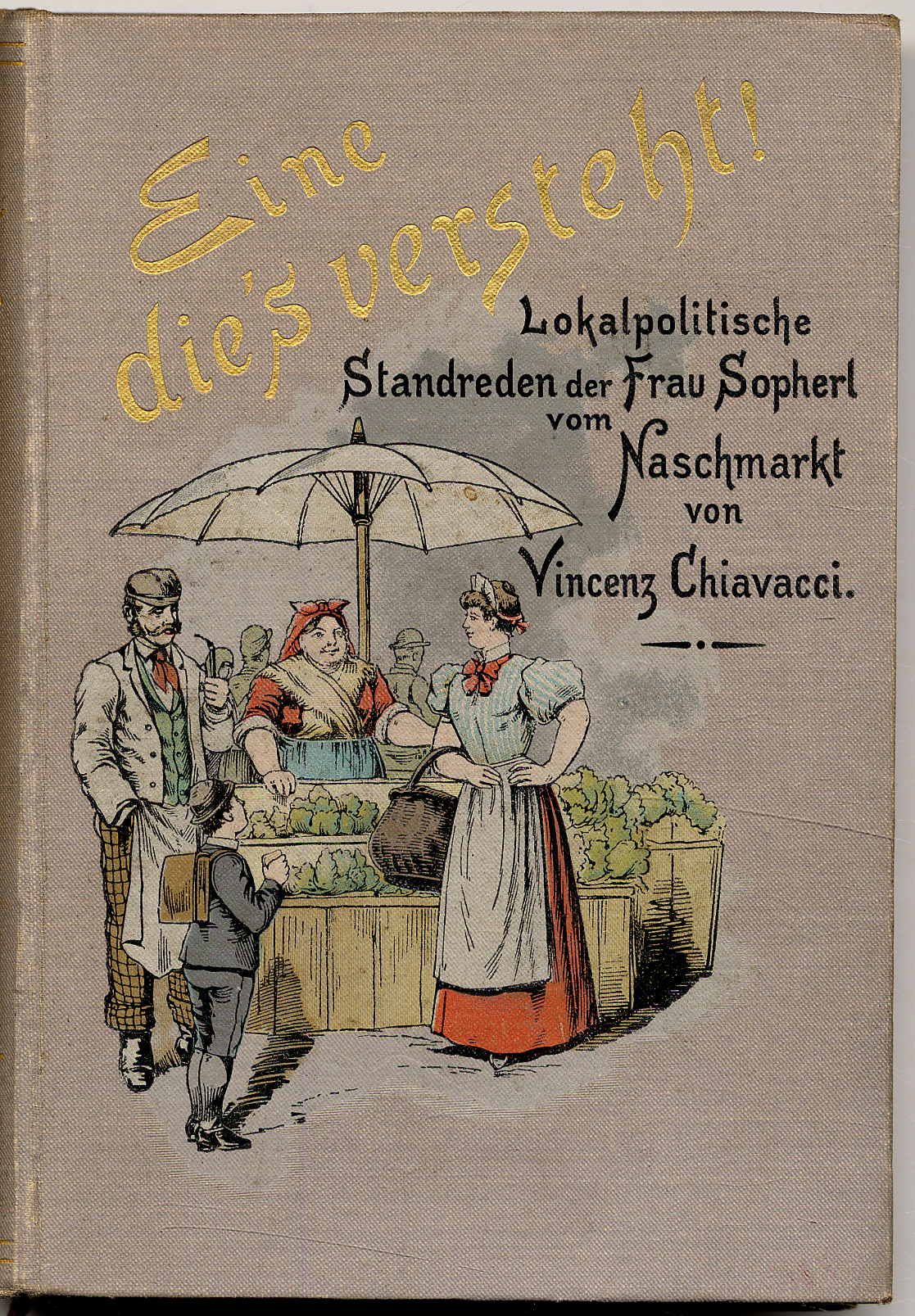 Chiavacci, Vincenz: Eine, die’s versteht. Lokal-politische Standreden der Frau Sopherl vom Naschmarkt. Stuttgart, Adolf Bonz & Comp., 1896. Ca. 16,5 x 11,5 cm. VIII S., 248 Seiten. Farbig illustr. Orig.-Leinenband. „Denn die Frau Sopherl ist eine „b’lehrte und b’lesen“ Person, die an alle Dinge des öffentlichen Lebens resolut herantritt und sie mit ihrem gesunden Verstand und ihrem Mutterwitz zergliedert. Als echtes Wiener Kind ist sie nie um einen Ausdruck verlegen …“ Gutes Exemplar im dekorativen Originaleinband.