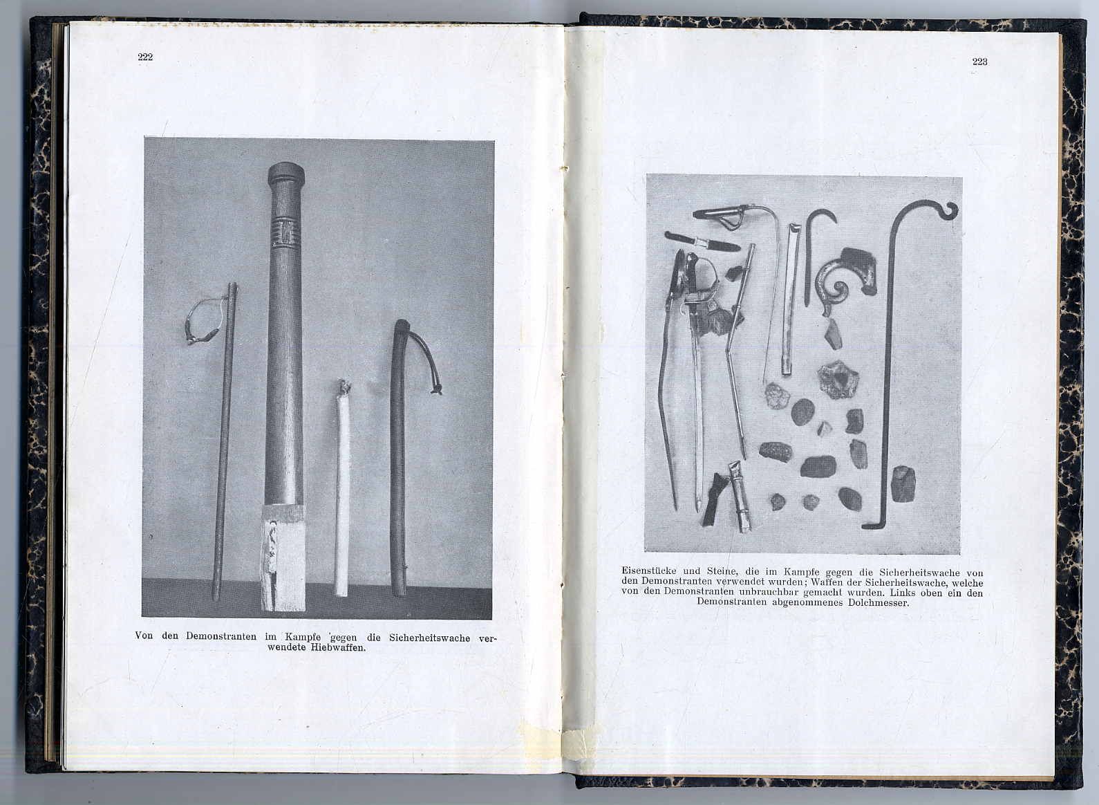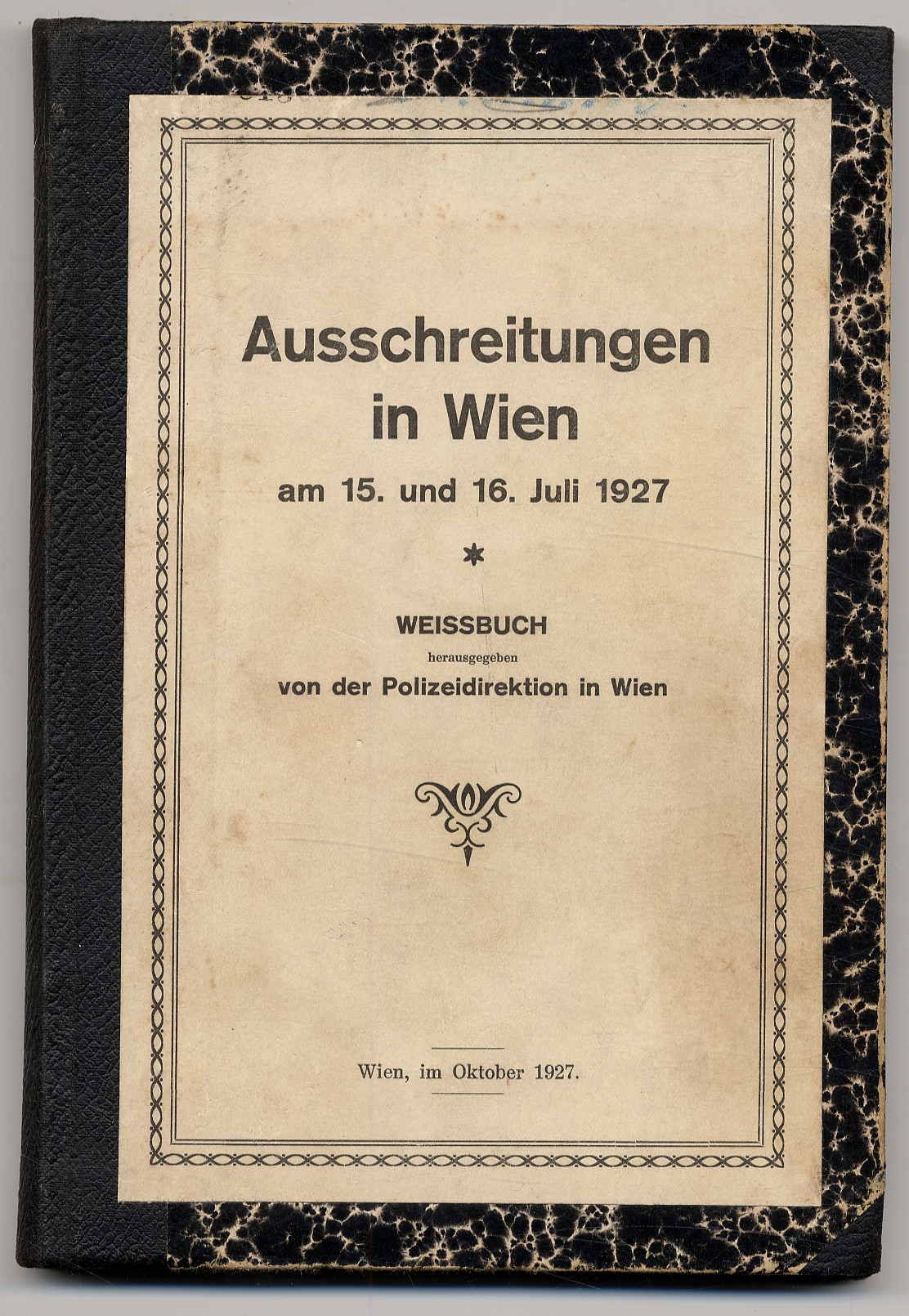 Polizeidirektion Wien (Hrsg.): Ausschreitungen in Wien am 15. und 16. Juli 1927. Weissbuch. Wien, Oktober 1927. Ca. 23 x 16 cm. 224 Seiten. Mit 40 fotografischen Abbildungen auf Tafeln. Halbleinenband der Zeit mit aufmontiertem Originalumschlag. Seiten papierbedingt leicht gebräunt. Nach der tödlichen Schießerei auf Schutzbündler in Schattendorf am 30. Jänner 1927 wurden die Täter im Juli 1927 trotz Indizienlast freigesprochen. Dies löste am 15. Juli 1927 Massendemonstrationen in Wien aus, die in gewaltsame Auseinandersetzungen und den Brand des Justizpalastes mündeten. Die Polizei ging mit äußerster Brutalität vor, es gab 89 Tote und über tausend Verletzte. Österreich stand am Rande eines Bürgerkriegs. Die Ereignisse führten zu Verhaftungswellen, einer Verschärfung der politischen Spannungen und der Stärkung extremistischer Kräfte.