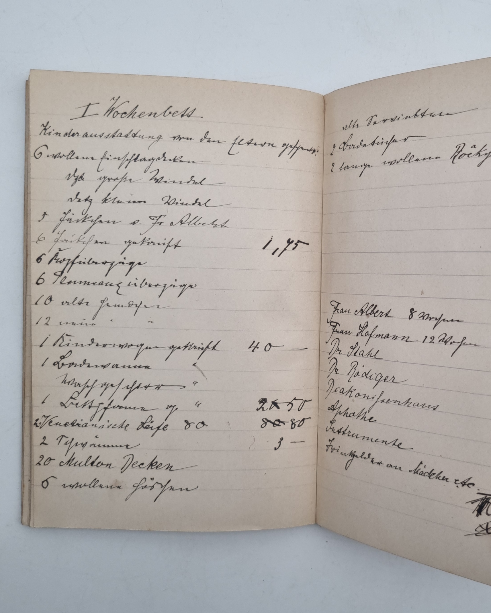 Ehlers, Anna (verh. Börsch): Ausstattung 1891. Deutsche Handschrift auf Papier. Ohne Ort [Hamburg], 1891. Ca. 15,5 x 10,5 cm. 29 beschriftete Seiten und einige leere. Halbleinenband der Zeit. Verzeichnis der Aussteuergegenstände und der Hochzeitsgeschenke. Anna Ehlers (1863-1932) heiratete 1891 den Pfarrer in Eschersheim Eugen Börsch (1859-1934). Anna Börsch korrespondierte wie ihr Sohn Rudolf mit Else Lasker-Schüler, ihre Tochter Lili wurde Kinderbuchautorin. Verzeichnet Wäsche aller Art, Kücheneinrichtung, Möbel, Wochenbett- und Kinder-Ausstattung. Interessant ist auch das Verzeichnis der Hochzeitsgeschenke. Kulturhistorisch interessant.