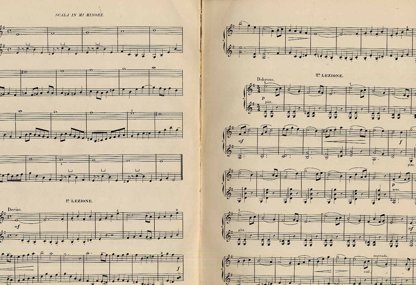 Piot, Julien: Il Violino ed il sijo meccanismo. Nuovo trattato completo per l’insegnamento. Milano, Carisch & Jänichen, ca. 1888. Ca. 34 x 26 cm. (6) S., 128 Seiten (Noten). Halbleinenband der Zeit. Text in Latein.