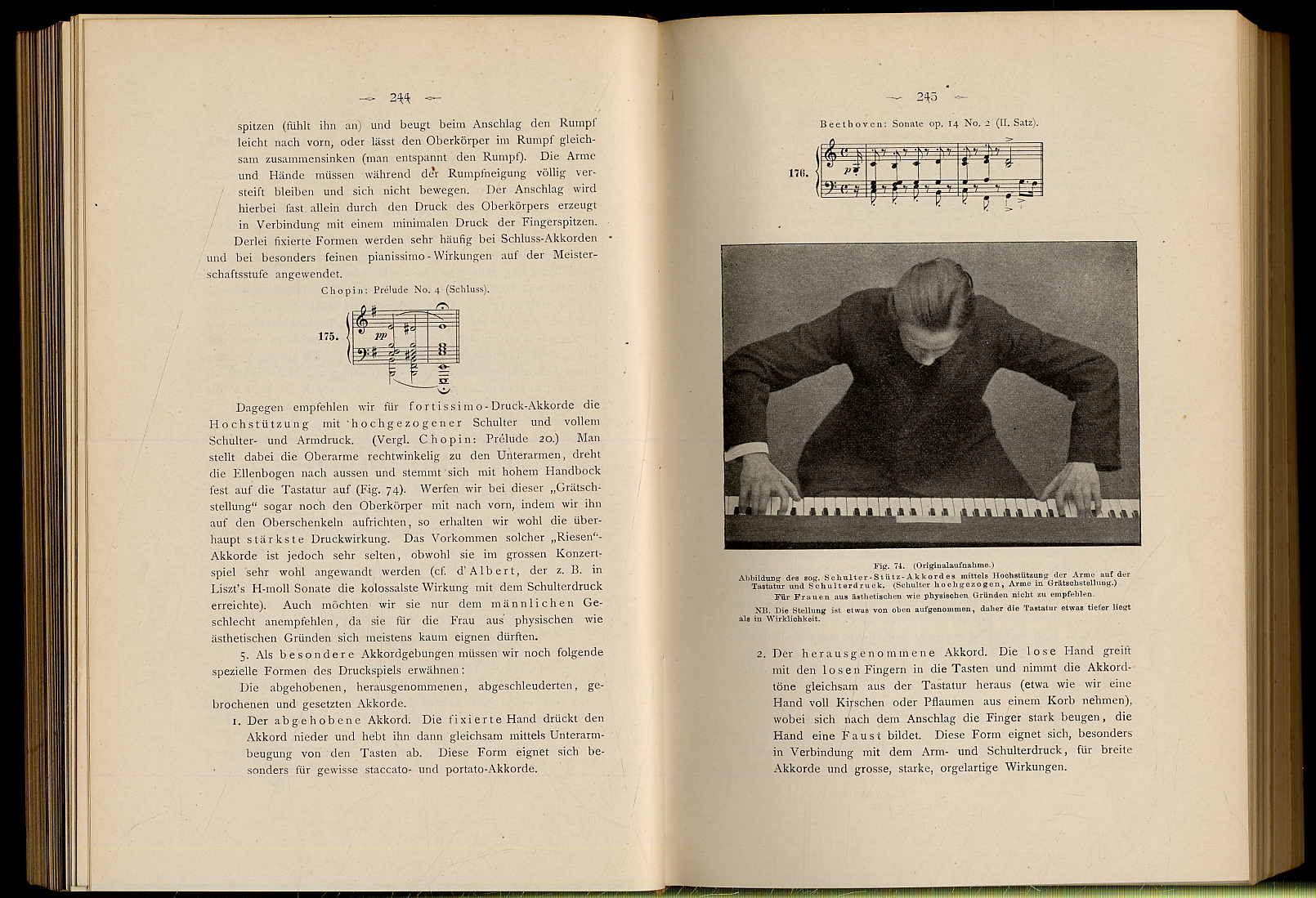 Breithaupt, Rudolf M.: Die natürliche Klaviertechnik. Band I: Handbuch der modernen Methodik und Spielpraxis für Künstler und Berufsspieler, Lehrer und Lehrerinnen, Konservatorien und Institute, Seminare und Schulen. Leipzig, C. F. Kahnt Nachf., 1912. Ca. 23,5 x 16,5 cm. XVII S., 804 S., (4) Seiten. Mit 82 Zeichnungen, photographischen Aufnahmen, graphischen Darstellungen, sowie 14 Tafeln und 539 Notenbeispielen. Schwarzer Leineneinband mit aufmontiertem Ausschnitt des Rückentitels. Titelblatt mit Stempel „20 % Kriegsaufschlag C. F. Kahnt“ sowie Besitzvermerk. Schnitt leicht fingerfleckig, sonst gutes Exemplar.