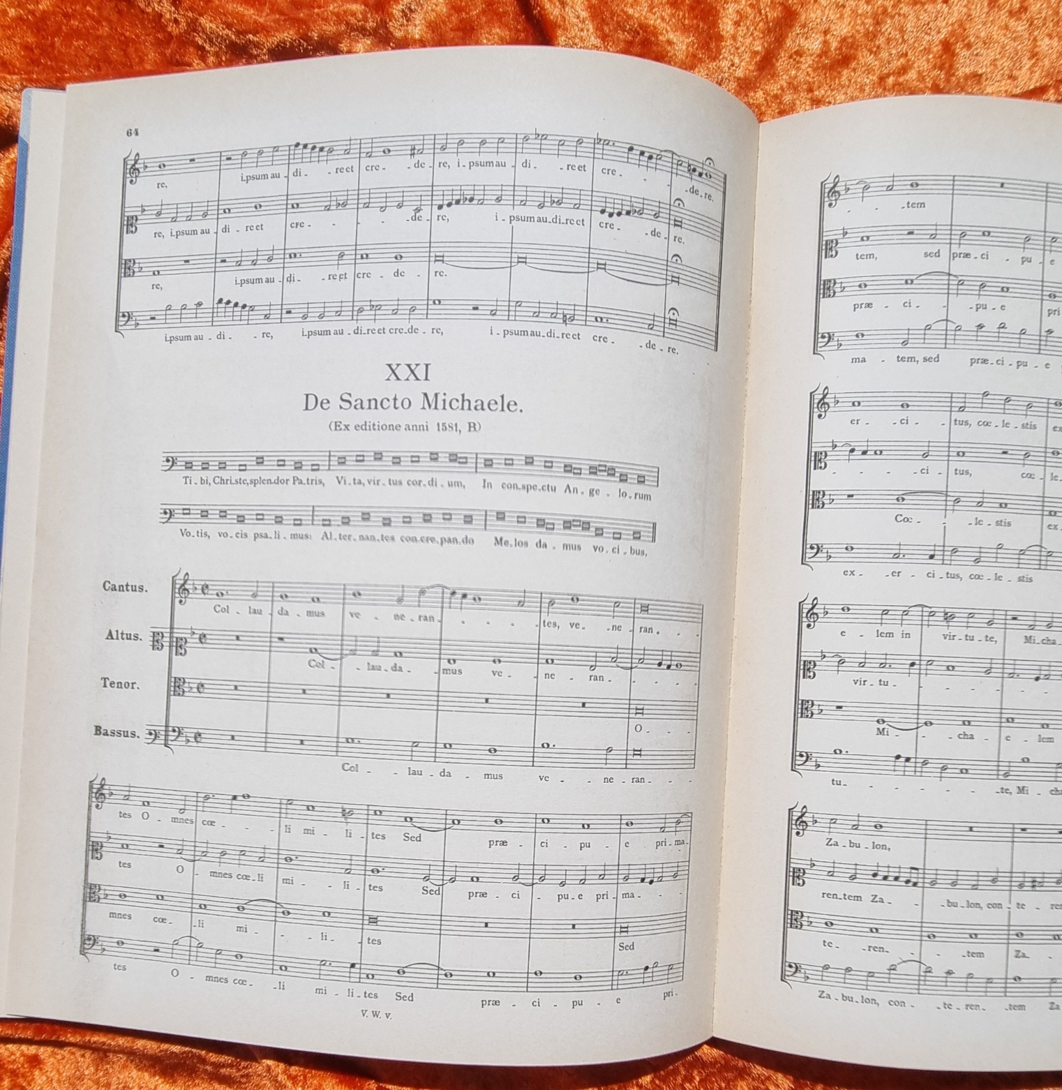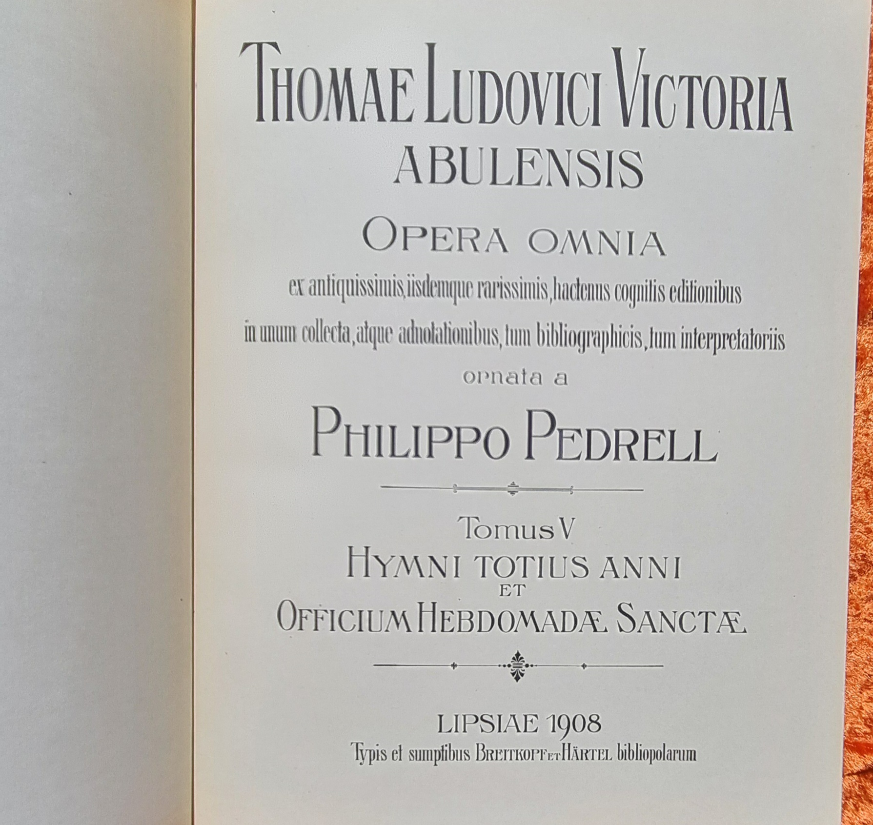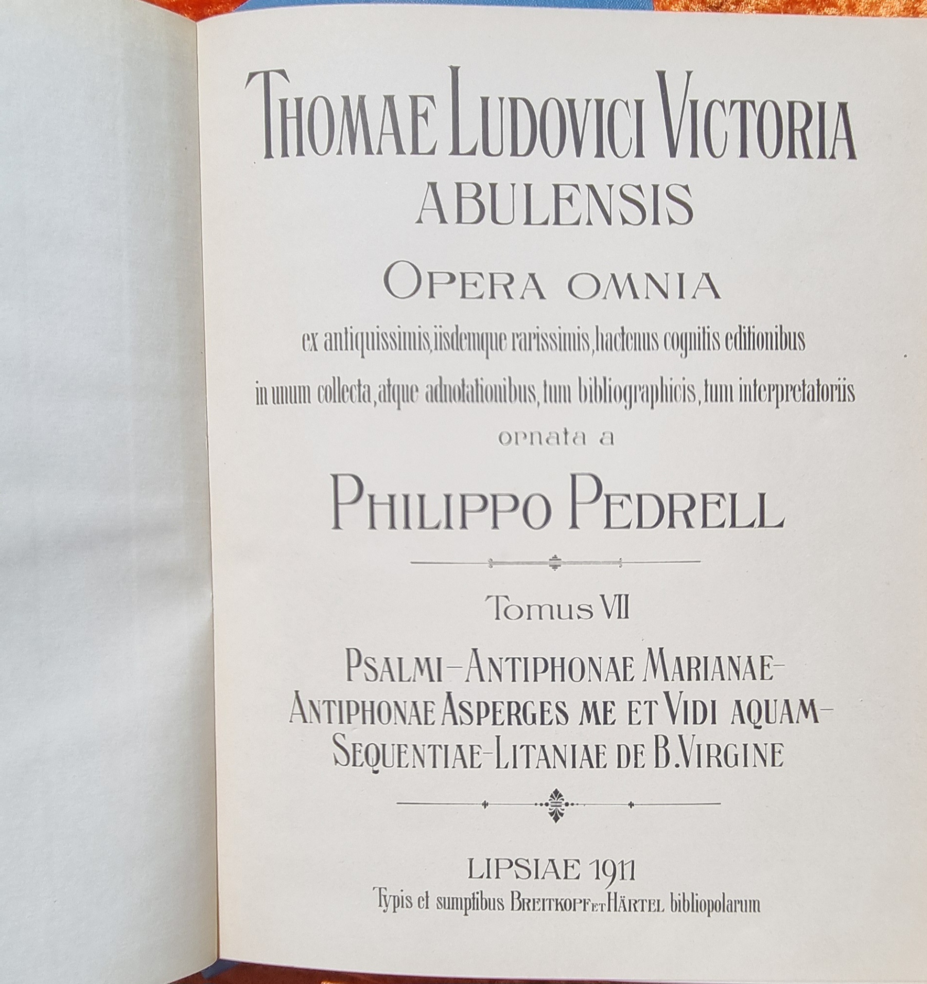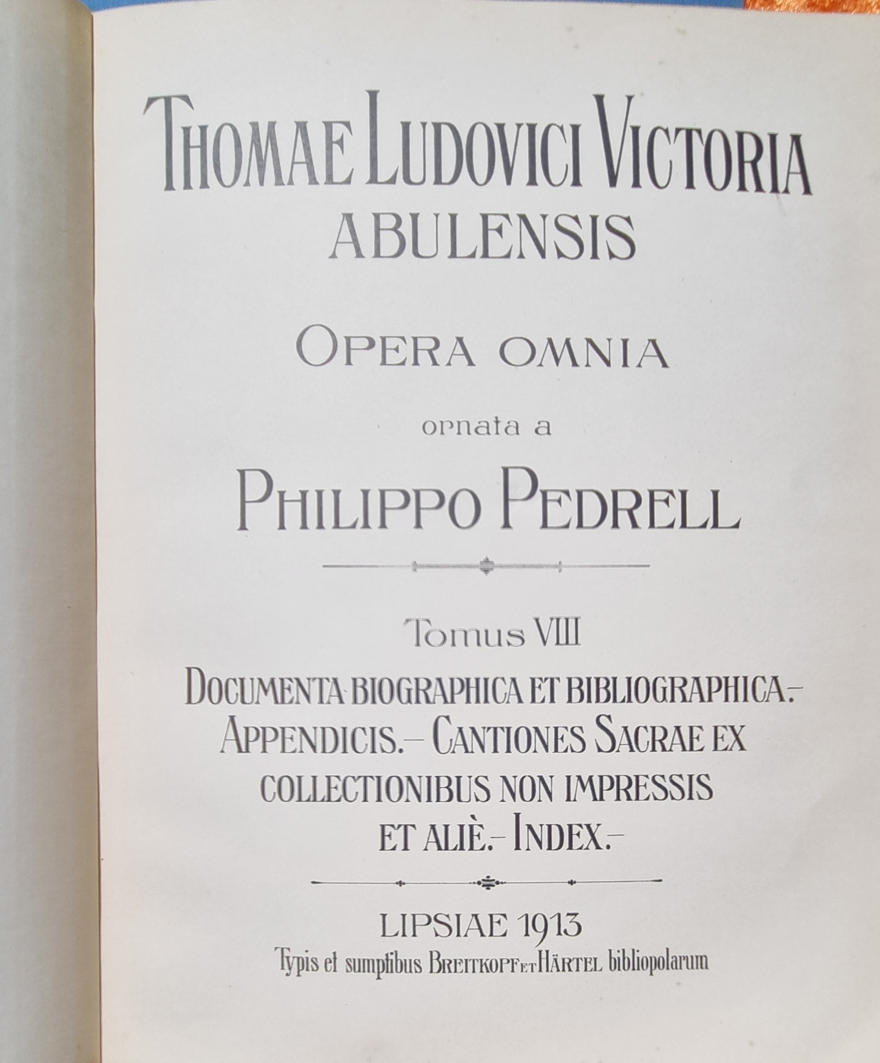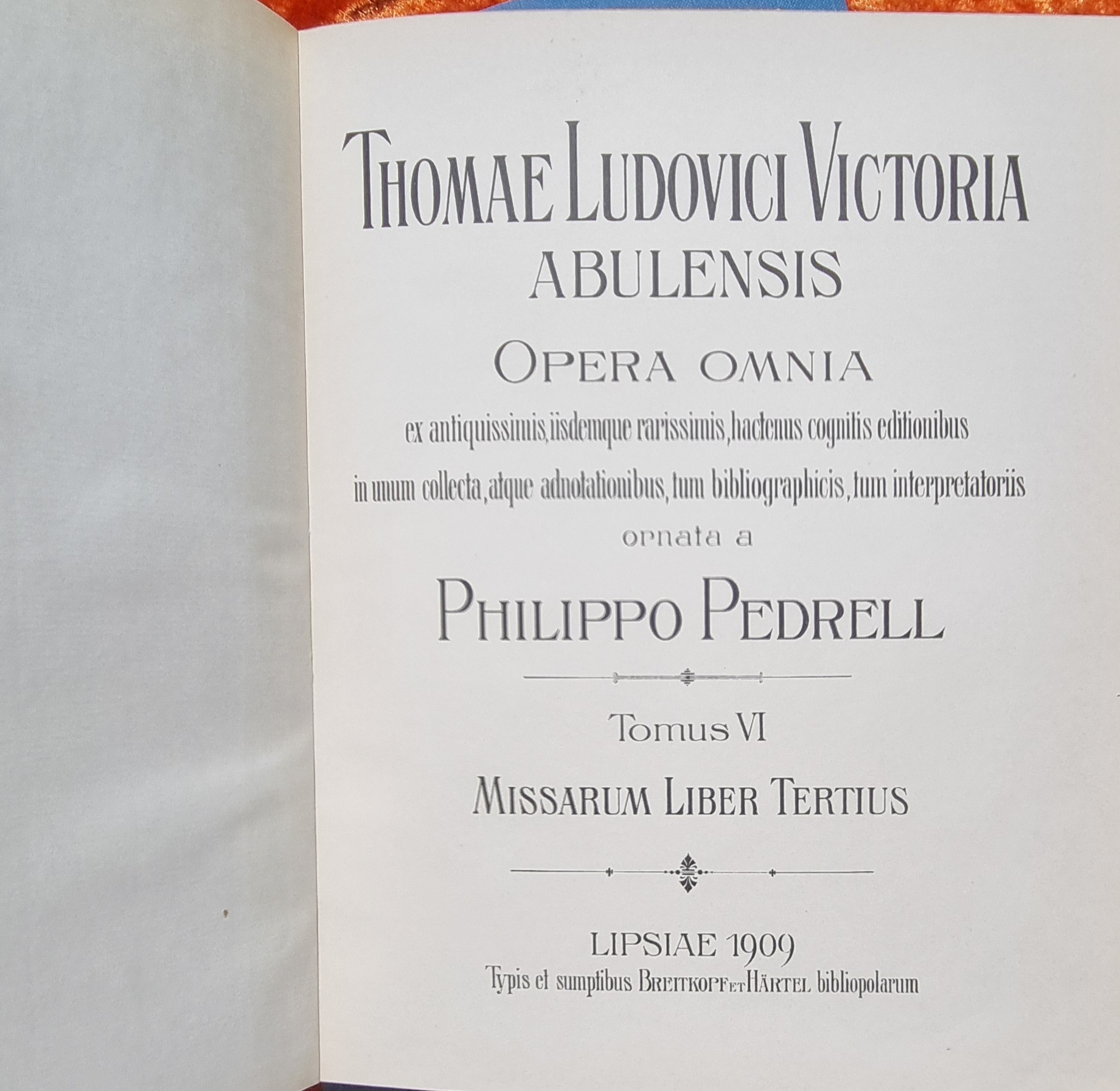 Victoria – Pedrel, Philipp (Hrsg.): Thomae Ludovici Victoria Abulensis. Opera omnia. Tomus V: Hymni totius anni et officium hebdomadae sanctae, 1908; Tom VI: Missarum liber tertius, 1909; Tom VII: Psalmi-antiphonae Marianae …, 1911; Tom. VIII: Documenta biographica et bibliographica …. 1913. 4 Bände. Leipzig, Breitkopf & Härtel, 1908-1913. Ca. 32,5 x 26 cm. 200 Seiten; 151 Seiten; 161 Seiten; XCVIII S., 57 Seiten. Halbleinenbände mit aufgezogener Deckelbroschur. Einbände minimal gebogen, jedoch gutes Exemplar. Tomás Luis de Victoria (* um 1548-1611, spanischer Komponist) war einer der bedeutendsten spanischen Komponisten der Renaissance und widmete sein Werk ausschließlich der geistlichen Musik. Tomus VIII enthält eine „Biographisch-Bibliographische Studie über den Meister von Avila Topmás Luis de Victoria und über die gegenwärtige vollständige Ausgabe seiner Werke“ in drei Sprachen (spanisch, deutsch, französisch).
