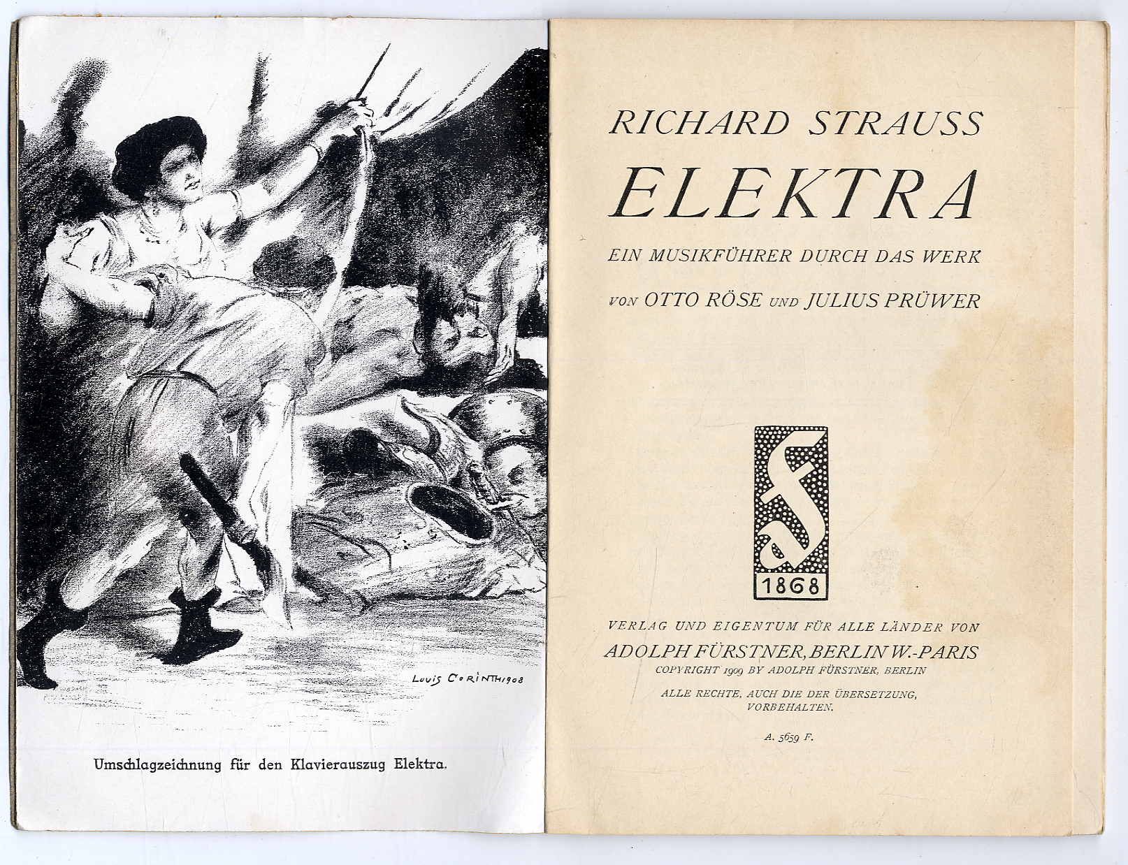 Strauss – Röse, Otto und Julius Prüwer: Richard Strauss. Elektra. Ein Musikführer durch das Werk. Berlin, Adolph Fürstenberg, 1909. Ca. 18,5 x 12,5 cm. 42 Seiten. Mit Titelbild und Notenbeispielen. Originalkartonierter Einband. Die enthaltene Faksimileseite ist die einzige derartige Abbildung der Elektrapartitur.