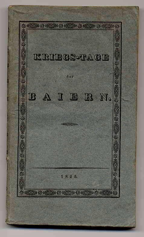 Kriegs-Tage der Baiern. Ein kriegsgeschichtlicher National-Calender. München, Michael Lindauer, 1825. Ca. 21 x 12,5 cm. (2) S., 21 Seiten und folgend nummerierte Blätter von Nr. 22 bis 117. Orig.-Broschur. Tabellarischer Überblick wichtiger Ereignisse aus der bayerischen Kriegsgeschichte vom 1. Januar bis 31. Dezember mit Angabe von Orten, Verbündeten, Befehlshabern, Gegnern. Seiten teils braunfleckig, jedoch gutes Exemplar.