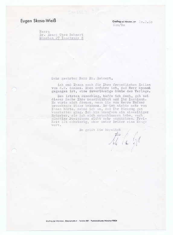 Skasa-Weiß, Maschinenschriftlicher Brief miteigenhändiger Unteschrift.