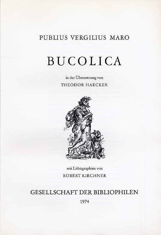 Vergil [Publius Vergilus Maro]: Bucolica in der Übersetzung von Theodor Haecker. [München], Gesellschaft der Bibliophilen, 1974. Ca. 45 x 30,5 cm. (54) unpagin. Seiten mit 17 (davon 11 ganzseitigen) Lithograpien von Robert Kirchner. Lose Bogen in der Original-Leinemappe. Faksimile-Ausgabe des Werkes, das 1965 in 98 Exemplaren im Selbstverlag des Künstlers erschienenen war. Eins von 1300 Exemplaren auf schwerem Bütten, erschienen als Jahresgabe der Gesellschaft der Bibliophilen e. V. 1974. Diese Ausgabe unterscheidet sich von der Original-Ausgabe durch die beiden Illustrationen der unpaginierten Seiten 23 und 33. Diese beiden Illustrationen wurden vom Künstler für diese Ausgabe neu geschaffen und von ihm selbst vom Stein gedruckt und handsigniert.