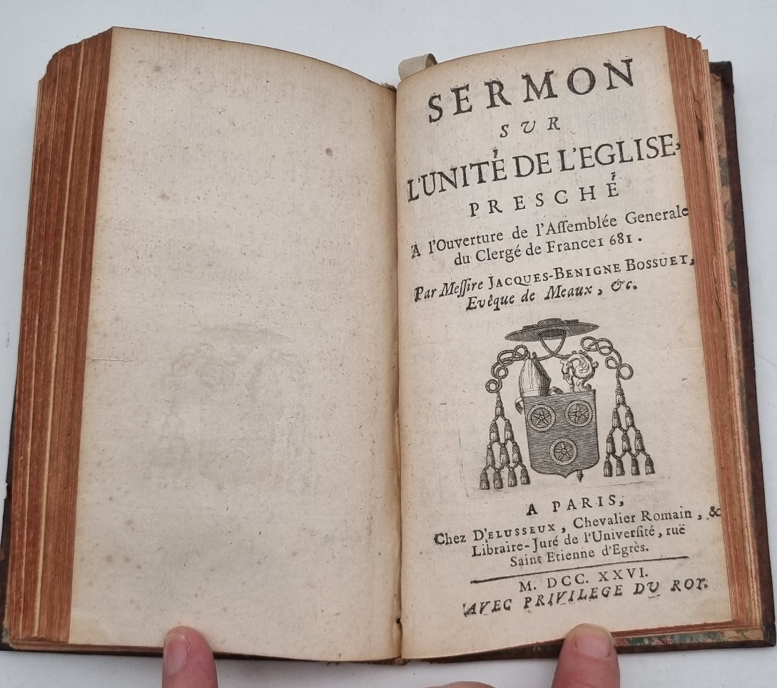 Bossuet, Jacques Benigne: 1) Maximes et reflexions sur la comedie; 2) Meditations sur la remission des pechez pour le tems du jubilé, et des indulgences; 3) Sermon sur l’unité de l’eglise presche. 3 Teile in einem Band. Paris, Delusseux, 1726-1729. Ca. 17 x 10 cm. (8) S., 152 Seiten; (12) S., 123 S., (5) Seiten; (2) S., 83 S., (1) Seite. Ledereinband der Zeit mit gedrucktem Rückenschild. Rücken mit kleinen Fehlstellen, sonst gutes Exemplar. In französischer Sprache.