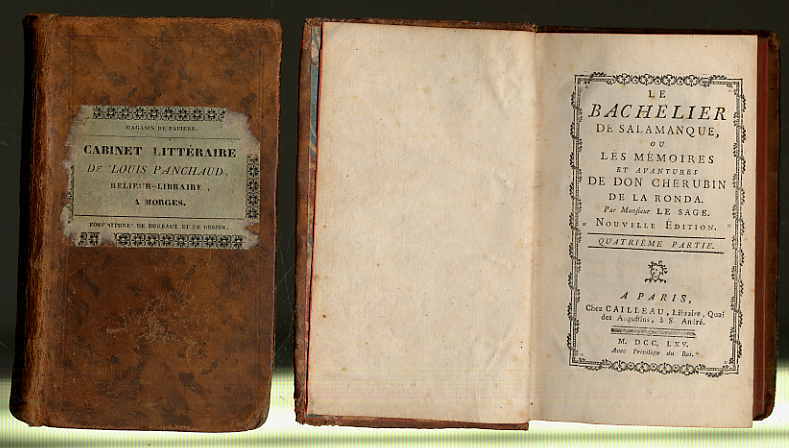 Le Sage, [Alain René]: Le Bachelier de Salamanque, ou les mémoires et avantures de Don Cherubin de la Ronda. Nouvelle édition. 6 Teile in 2 Bänden. Paris, Cailleau, 1765. Ca. 14,5 x 8,5 cm. Ledereinbände der Zeit mit reicher Rückengoldprägung und geprägten Rückenschildern. Kanten bestoßen. Privates Bibliotheksschild auf Vorderdeckel (nur teils vorhanden). Einige Seiten etwas fleckig, jedoch gutes Exemplar. In französischer Sprache.