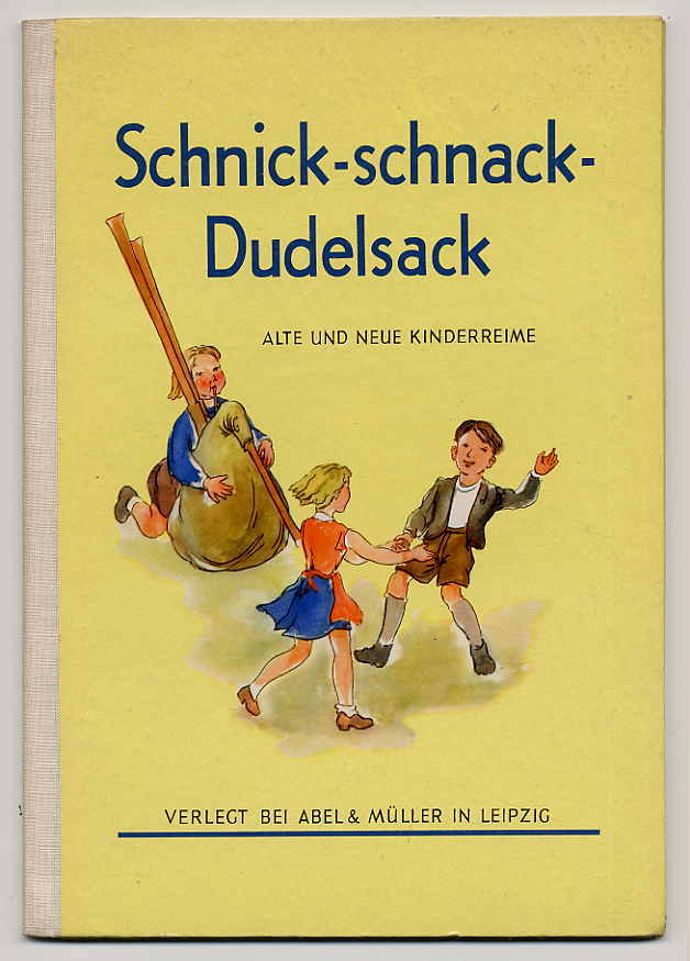 Kraft, Ruth: Schnick-schnack-Dudelsack. Alte und neue Kinderreime, ausgewählt und ergänzt. Leipzig, Abel & Müller Vlg., [1954]. Ca. 29,5 x 20,5 cm. 16 unpagin. Seiten mit teils farbigen Bildern von Karl Wernicke. Farbig illustr. Orig.-Halbleinenband. Muck II, 5522. Z.B. „Unser Städtchen dehnt sich aus: – Straßen, Plätze, Haus an Haus, – Bäume, Blumen, grünes Gras, – Buddelplätze, welch ein Spaß!“. Einband leicht angestaubt. Gutes Exemplar.