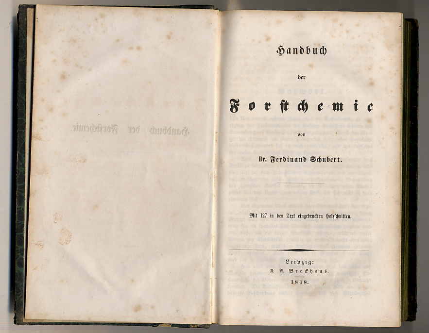 Schubert, Ferdinand: Handbuch der Forstchemie. Leipzig, F.A. Brockhaus, 1848. Ca. 23 x 14,5 cm. XIV S., (2) S., 732 Seiten. Mit 127 in den Text gedruckten Holzschnitten. Halblederband der Zeit mit geprägtem Rückentitel. U.a.: Reine Chemie; Anorganische Chemie; Organische Chemie; Forstchemie; Forstliche Pflanzenchemie; Chemie der Forstbenutzung; Kohlenbrennerei; Conservation des Holzes; Theerschwelerei u.a. Einband etwas berieben. Seiten stockfleckig. Namenszug auf Vorsatz.