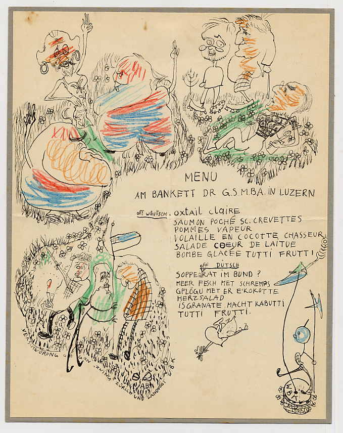 Originalzeichnungen Clenin, Walter (1897-1988; Maler). Folge von 16 Originalzeichnungen (davon 3 koloriert). Verschiedene Formate. Auf 13 Kartonblätter montiert. In Halbleinenmappe. Walter Clénin verbrachte seine Jugend in Tschugg bei Erlach. Die Eltern – als Lehrerin und Lehrer tätig – zogen 1911 nach Wabern bei Bern. 1913-14 Besuch der Gewerbeschule in Bern. Der Plan, an die Rijksakademie nach Amsterdam zu gehen, wurde durch den Krieg vereitelt. 1914-15 Ecole des Beaux-Arts in Genf. 1917 Rekrutenschule und Aktivdienst im Jura. Erkrankte 1918 an der Grippe. Nach dem Krieg Reisen nach München, Wien, Paris, nach Italien und Tunesien. Heirat mit Hannuscha von Harten, Tochter eines nach Bern emigrierten russischen Staatsministers. Auftragsporträts für Theologieprofessor Albert Schädelin und Regierungsrat Leo Merz. Öffentlicher Auftrag für das Wandbild Singende Kinder im Schulhaus Laubegg in Bern 1923-24. Der 1925 in der Ausstellung Schweizer Kunst in Karlsruhe ausgestellte Entwurf des Bildes führte zur Wettbewerbseinladung für die Ausmalung des Audienzsaales im Bundesgericht in Lausanne; der sechsteilige Zyklus Das Volk im Rechtsstaat und Engel des Jüngsten Gerichts gelangten 1929-1933 zur Ausführung. 1934 Rückzug auf die Festi in Ligerz, wo sich Ende der 20er Jahre eine Künstlerkolonie um Ferdinand und Elsi Giauque gebildet hatte. Zum Freundeskreis gehörten Traugott Senn und Jakob Probst. Eine Gemeinsamkeit stellten die Marionetten-Inszenierungen dar. Wandbildaufträge für die Aula der Universität Bern 1934 und für den Schweizer Pavillon an der Weltausstellung in Paris 1937. Es folgten 1940-47 Wandbilder für Schulen und Aufträge für das Bundesbriefarchiv in Schwyz und 1943-1953 für das Wohlfahrtshaus der Maschinenfabrik Bührle. 1945-1956 lebte Clénin in Biel. Aufträge für Kirchgemeindehäuser und Kirchen im Kanton Bern. 1956 wurde er als Professor für architekturbezogene Malerei und Wandmaltechnik an die Rijksakademie in Amsterdam berufen. 1966 Rückkehr in die Schweiz mit seiner zweiten Frau Christine van den Ende. Aktiv in der Heimatschutz- und Denkmalpflegeberatung, unter anderem in Aarberg. Die bisher einzige monografische Ausstellung wurde 1983 durch den Kunstverein Biel organisiert. (vgl. Andreas Meier in SIKART).