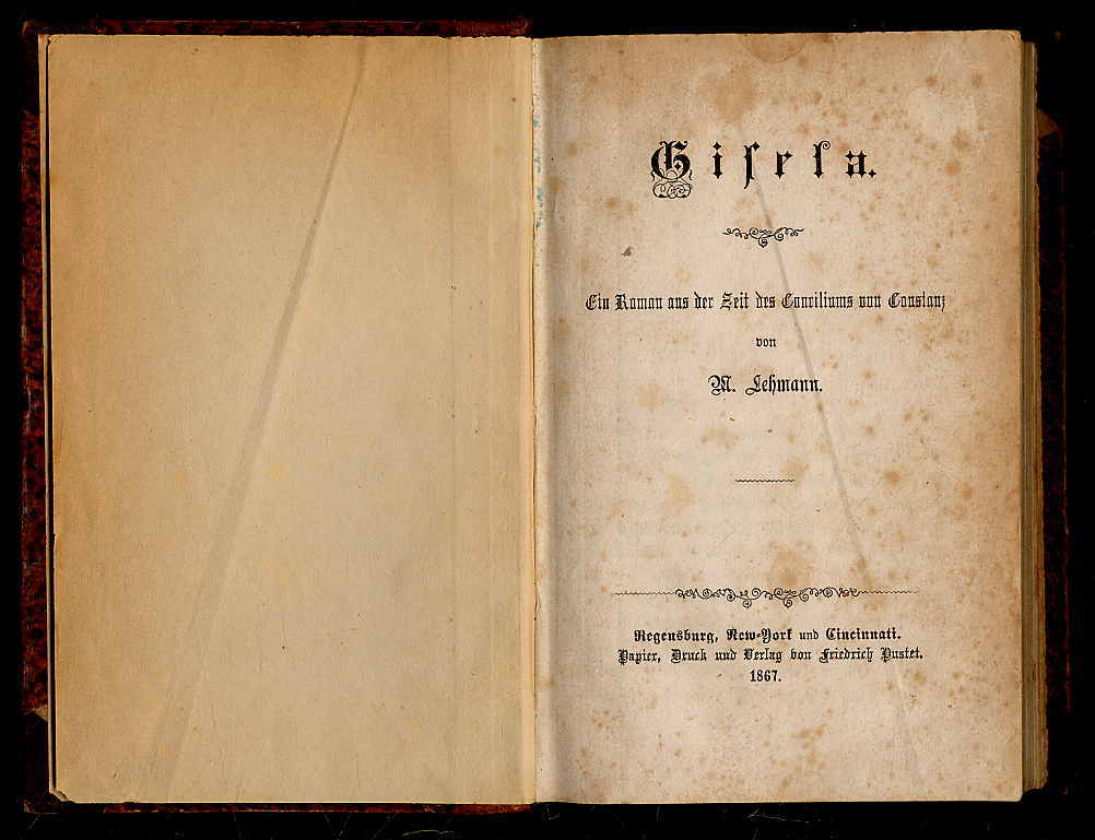 Lehmann [Michael]: Gisela. Ein Roman aus der Zeit des Conciliums von Constanz. Regensburg u.a., Friedrich Pustet, 1867. Ca. 17,5 x 11,5 cm. VI S., (2) S., 368 Seiten. Halblederband der Zeit. Exemplar aus einer Leihbibliothek in Bad Aibling. Mit Stempel auf Vorsatz und einmontiertem Werbezettel der Firma Offner, die eine Buchbinderei, Leihbibliothek, Zimmervermietung und den Galanterie- und Schreibwaaren-Laden betrieb. auf Innendeckel. Rücken mit unbeschriebenem Papierschild. Einband etwas berieben. Seiten teils stockfleckig.