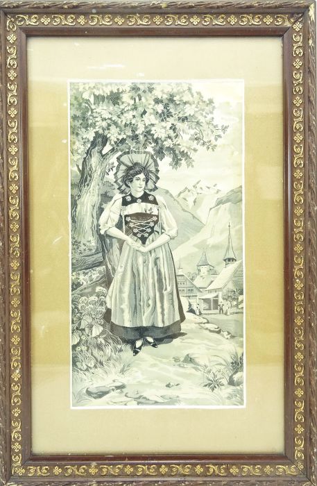 Seidenbild – Brauchtum – Seidenbild – Berner Mädchen. Um 1900. Ca. 17 x 32,5 cm. Unter Passepartout, mit Rahmen, hinter Glas. Gewebtes Seidenbild. Eine junge Frau in alpenländischer Sonntagstracht, mit Haube, vor einer Dorfansicht mit Gebirge. „Im Jahre 1900 wurden die beiden grossen Seidenbilder „Berner Mädchen“ und „Aargauer Mädchen“ gewoben. Der Entwurf stammte vom Dessinateur Emil Himmelsbach. (Th. Schaltenbrand, Band im Bild, S. 20/21).