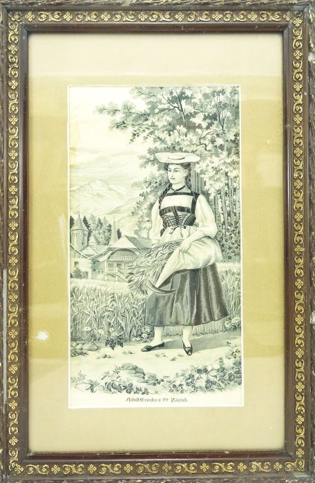 Seidenbild – Brauchtum – Seidenbild – Aargauer Mädchen. Seidenbild, mit eingewebter Firmenbezeichnung „Adolf Grieder & Cie. Zürich“. Um 1900. Ca. 17,5 x 32,5 cm. Unter Passepartout, mit Rahmen, hinter Glas. Gewebtes Seidenbild. Aargauer Mädchen, junge Frau in Werktagstracht vor einer Dorfansicht, im Hintergrund Gebirge. „Im Jahre 1900 wurden die beiden grossen Seidenbilder „Berner Mädchen“ und „Aargauer Mädchen“ gewoben. Der Entwurf stammte vom Dessinateur Emil Himmelsbach. (Th. Schaltenbrand, Band im Bild, S. 20/21).Adolf Grieder (1854-1933), gründete 1889 die Firma Adolf Grieder & Cie., Seidenwaren, für Versand und Detailverkauf. Linker Rand etwas braunfleckig.
