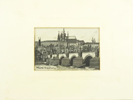 Seidenbild – Orts- und Landeskunde – Prag – Seidenbild – Praha – Hradcany. Um 1910. Querformat, ca. 6,5 x 9,5 cm. Unter Passepartout fest montiert. Gewebtes Seidenbild mit Karlsbrücke und Blick zur Burg.