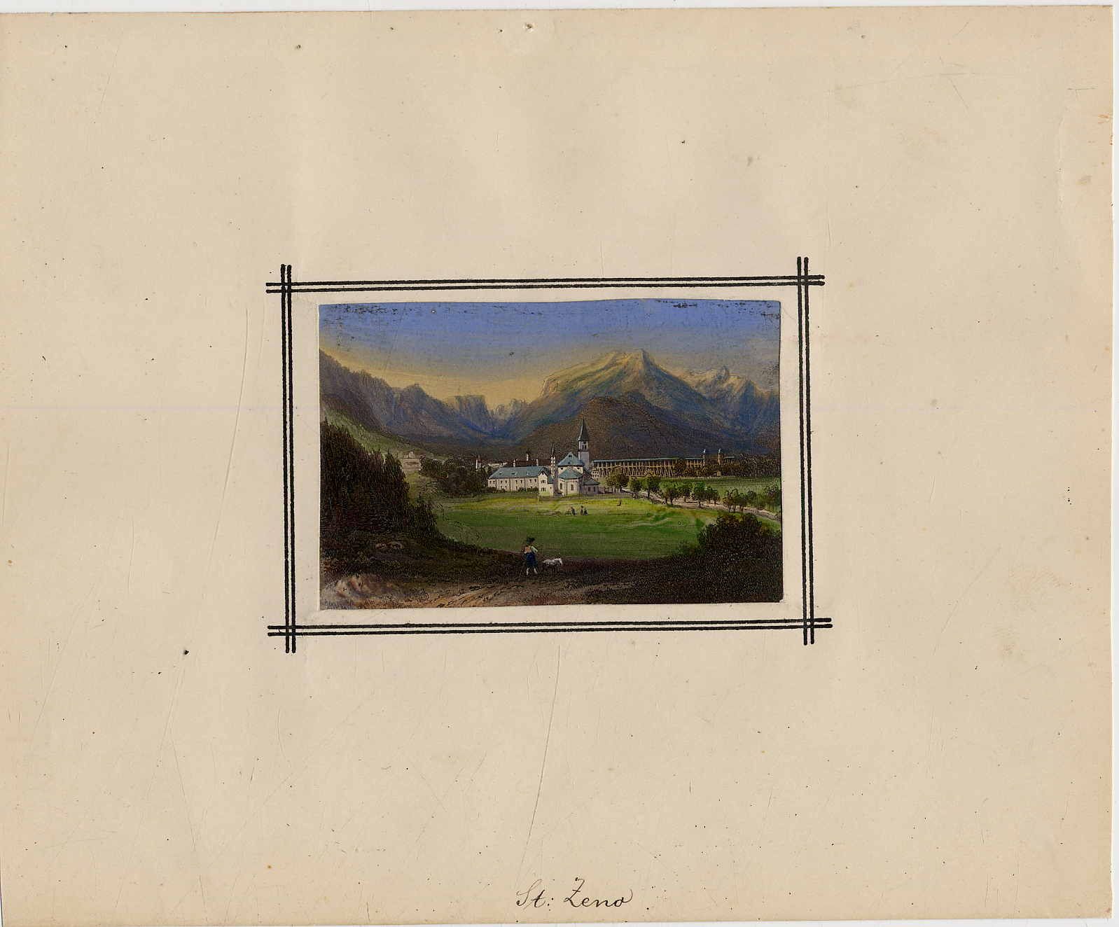 Bad Reichenhall – St. Zeno. Ca. 1830. Ca. 5,5 x 8 cm. Sehr schön altkolorierte Aquatintaansicht. Das originale Blatt ausgeschnitten und in ein Passepartout montiert, darunter die alte Beschriftung „St. Zeno“. Am Himmel kleine schwarze Fleckchen, jedoch sehr hübsches Bild.