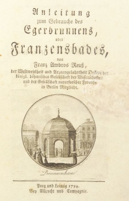 Reuß, Franz Ambros(ius): Anleitung um Gebrauche des Egerbrunnens, oder Franzensbades. Prag und Leipzig, Albrecht und Compagnie, 1794. Ca. 17,5 x 10,5 cm. (8) S., 2 gefaltete Tabellen (A-C), 96 ., (4) Seiten. Mit gestochener Titelvignette. Einfache Broschur der Zeit. Erste Ausgabe. Reuß (1761-1830) war fürstlich Lobkowitz’scher Brunnenarzt zu Bilin. „Die zahlreichen Arbeiten über Zusammensetzung, Geologie und Verwendung der Mineralquellen von Bilin, Franzensbad, Saidschutz, Liebwerda, Teplitz etc., sowie seine Ausführungen über bergmännische Aspekte der Mineral vorkommen führten 1808 zur Ernennung zum ksl. Bergrat“ (Dietrich Herm in NDB 21, 458). Unleserlicher Stempel auf Titelblatt. Einband etwas berieben.