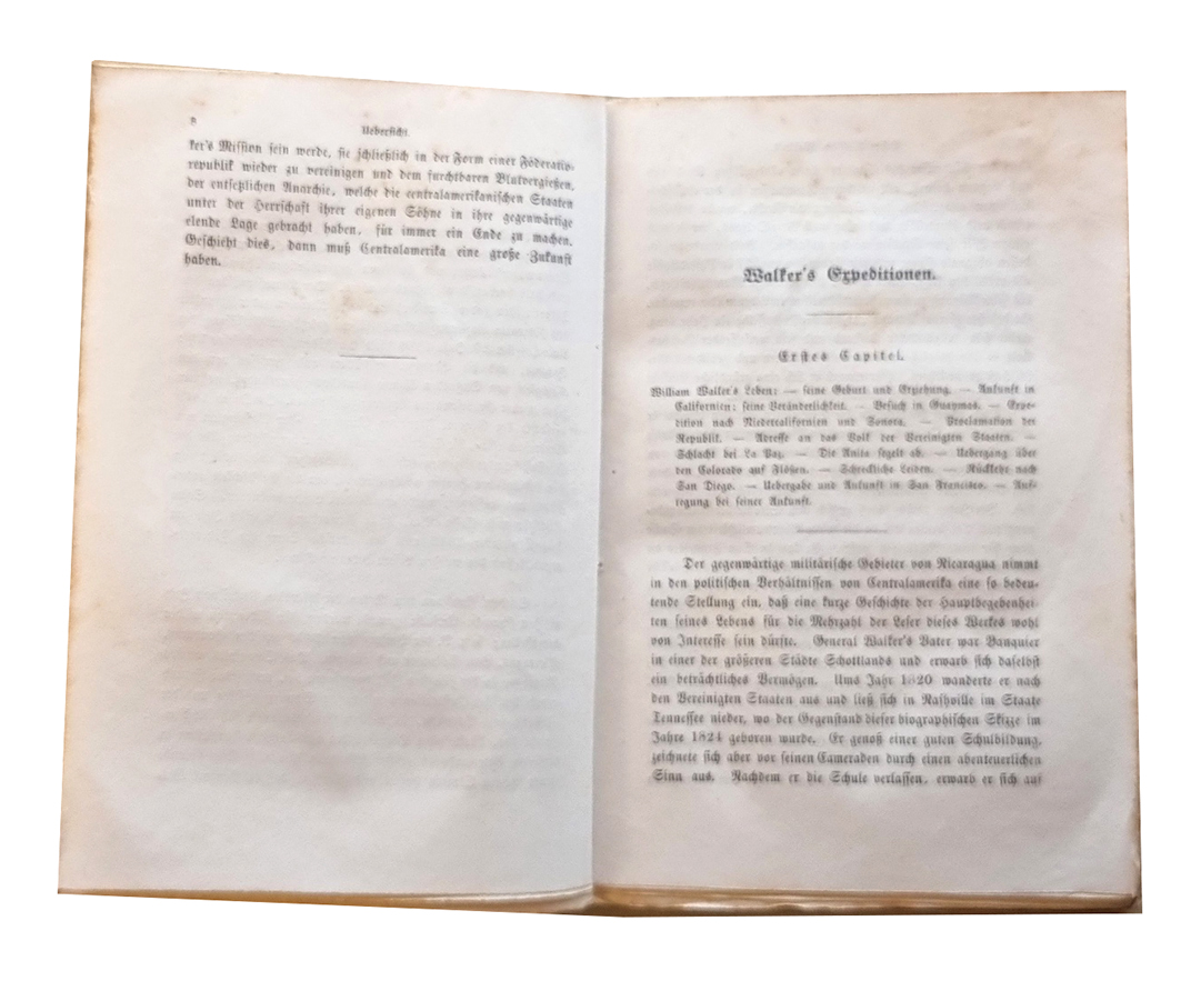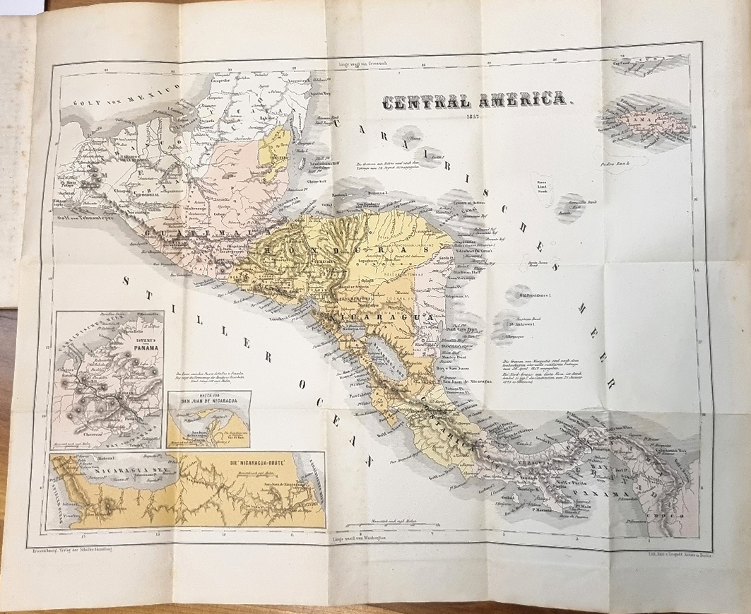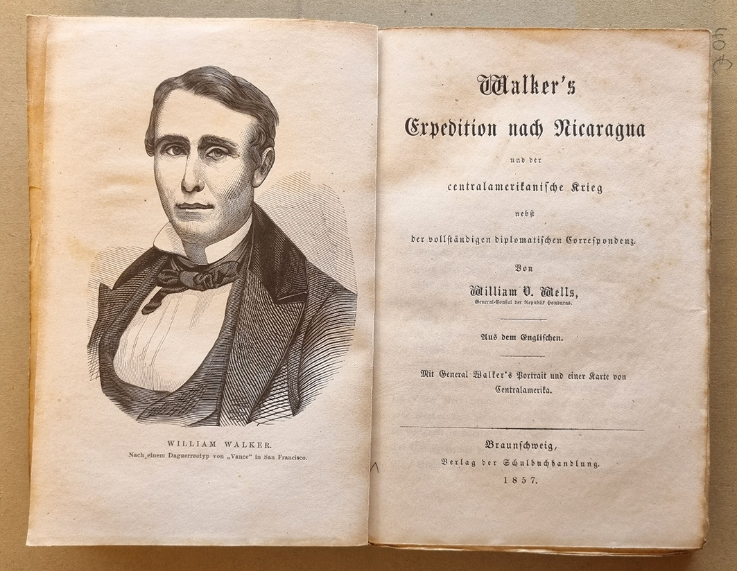 Nicaragua – Wells, William V.: Walker’s Expedition nach Nicaragua und der centralamerikanische Krieg nebst der vollständigen diplomatischen Correspondenz. Aus dem Englischen. Braunschweig, Verlag der Schulbuchhandlung, 1857. Ca. 18,5 12 cm. X Seiten, 217 Seiten. Mit General Walker’s Portrait (Holzschnitt) und einer mehrfach gefalteten, farbigen lithographierten Karte von Centralamerika. Orig.-Broschur. Der US-Amerikaner William Walker (1824 – 1860, Arzt, Anwalt, Jurist, Söldner) eroberte mit seiner Söldnertruppe Nicaragua und rief sich 1856 zum Präsidenten des Landes aus. 1860 wurde er in Honduras hingerichtet. „Der kühne Vorfechter der amerikanischen Idee in Nicaragua, General Walker, ist eine, für das Wesen des modernen Amerikanerthums in hohem Grade charakteritische Persönlichkeit; klug berechnend, entschlossen bis zur Tollkühnheit, und von einer zähen, rücksichtslosen Energie, wie sie sich bei anderen Nationen selten findet, scheint er ganz zum Dictator der weichlichen und charatkerlosen spanisch-amerikanischen Bevölkerung geschaffen. … Der Autor faßt die Ereignisse in Nicaragua vom amerikanischen Partheistandpunkte auf, was indessen, wenn auch im Gegensatz zu der politischen und moralischen Anschauungsweise mancher Leser, als ein Vorzug des Buches zu betrachten ist: denn es zeigt das Unternehmen Walkers nicht als vereinzelt dastehenden, abentheuerlichen Raubzug, sondern im Zusammenhange mit der Politik der nordamerikanischen Freistaaten, und indem wir die Sympathie kennen lernen, welche Walker bei einer ungeheuren Parthei seiner Landsleute findet …“ (″Ankündigung“ des Verlages). Unaufgeschnittenes, breitrandiges Exemplar, teils stockfleckig. Erste deutsche Ausgabe.