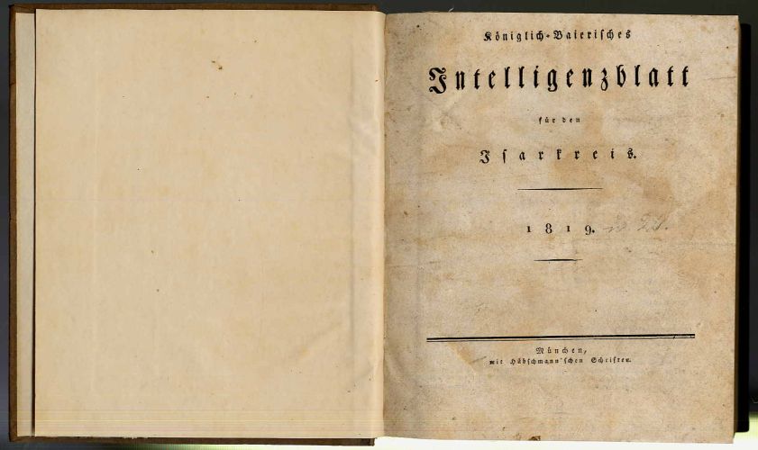 Königl.-Baierisches Intelligenzblatt für den Isarkreis 1819. München, Hübschmann’sche Schriften, 1819. Ca. 24 x 20,5 cm. 1109 Spalten, (36) Seiten. Pappband der Zeit mit Rückenschild. Teils leicht stockfleckig. Enthält amtliche Verlautbarungen und Nachrichten der Regierung und Bekanntmachungen der Kreisgemeinden, Handelsnachrichten, Termine für Versteigerungen, Amtssachen, sowie Dienstnachrichten, Anzeigen, Personalnachrichten etc. U.a.: Versteigerung Schwaigerhof, Niederaschau, Dauer des Kirchweihmarktes in Velden; Die Erledigung der Pfarrey Starnberg betreffend; Suche nach den Erben des verstorbenen Pfarrers in Götting; „Es wird hiermit officiell bekannt gemacht, daß Georg Anglhuber, Bäck zu Pfetrach, wegen seines leichtsinnigen Lebenswandels und wegen schlechter Bewirthschaftung seines Vermögens, auf Andringen meherer Betheiligten, und mit seiner eigenen Einwilligung, unfähig erklärt wird, Schulden zu contrahiren …“; Versteigerung der Hofmark Schönbrunnn. Mit umfangreichem Sach- und Ortsregister.