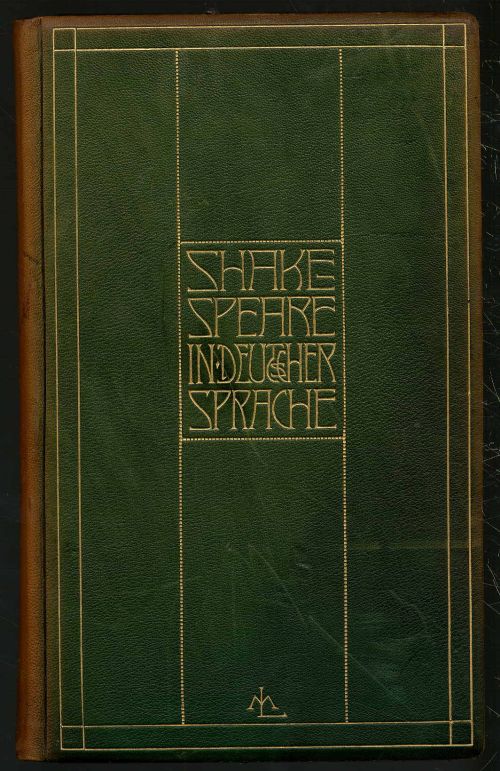 Shakespeare – Shakespeare in deutscher Sprache. VIII. Band. Was ihr wollt – Mass fuer Mass – Troilus und Cressida – Timon von Athen. Berlin, Georg Bondi, 1913. Ca. 25,5 x 16 cm. 433 Seiten. Illustrierter Doppeltitel und Buchschmuck von Melchior Lechter. Grüner Original-Ganzledereinband mit Goldprägung, signiert ML (Melchior Lechter), mit Innenkantenvergoldung und grünem Buchschnitt. Band 8 (von 10). Herausgegeben und zum Teil neu uebersetzt von Friedrich Gundolf. Ursprünglich kräftig grün gefärbt, sind der Einbandrücken und die Kanten (wie meist) naturbraun ausgeblichen, die Deckel weitgehend im Originalgrün, etwas berieben. Mit illustriertem Doppeltitelblatt und durchgehend mit Randbordüren und Initialen. Druck in Rot und Schwarz auf feingeripptem Bütten. Der Einband mit vergoldeten Fileten, Deckel- und Rückentitel sowie Monogrammtitel »SWIDS« auf dem Hinterdeckel. Satz aus der Neuen Elzevir, Druck unter Leitung von Melchior Lechter bei Otto von Holten.