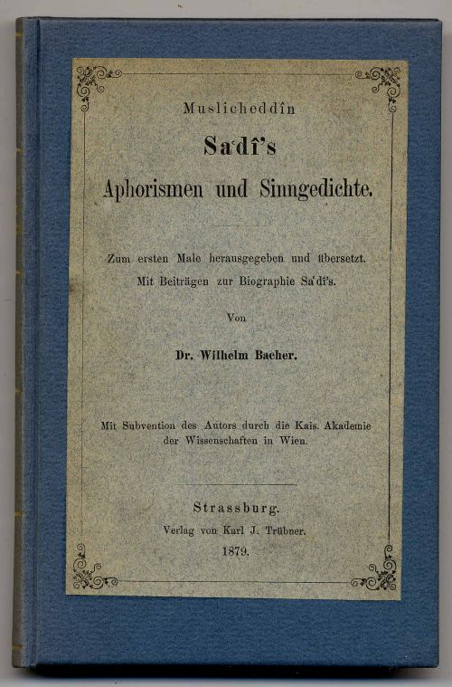 Muslicheddîn Sadi: Aphorismen und Sinngedichte Zum ersten Male herausgegeben und übersetzt. Mit Beiträgen zur Biographie Sa’di’s von Wilhelm Bacher. Strassburg, Karl J. Trübner, 1879. Ca. 19 x 12,5 cm. LXXIV S., 200 Seiten. Moderner Pappband mit aufgezogenem Deckeltitel. Vorsätze erneuert. Das ausführliche Vorwort in Deutsch, der Hauptteil in deutsch und persisch. Gutes Exemplar der seltenen Ausgabe.