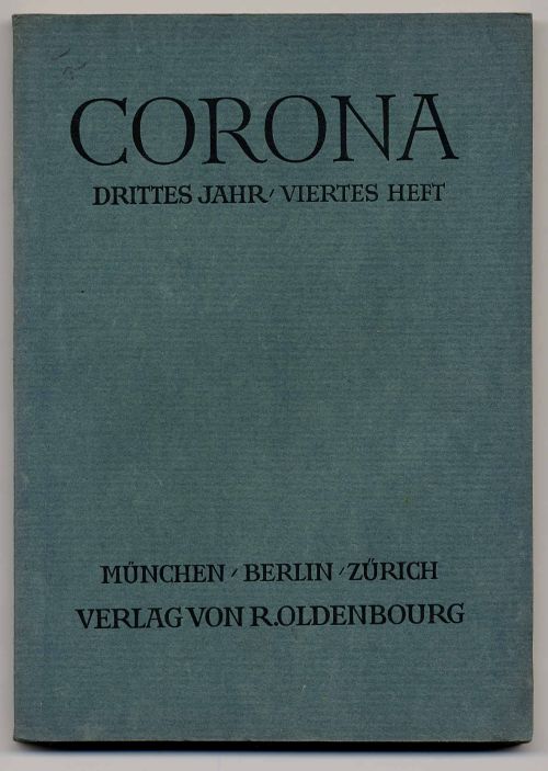 Bodmer, Martin und Herbert Steiner (Hrsg.): Corona. Drittes Jahr, viertes Heft, April 1933. München – Berlin, R. Oldenbourg, 1933. Ca. 21 x 15 cm. Grüner originalkartonierter Einband. Schnitt leicht fleckig. Corona, literarischen Zweimonatsschrift, die in den Jahren 1930 bis 1943 in München und Zürich erschien. Mit Beiträgen u.a. von Karl Alexander v. Müller, Max Mell, Josef Hofmiller, Nikolai Leskow,Max Unger.
