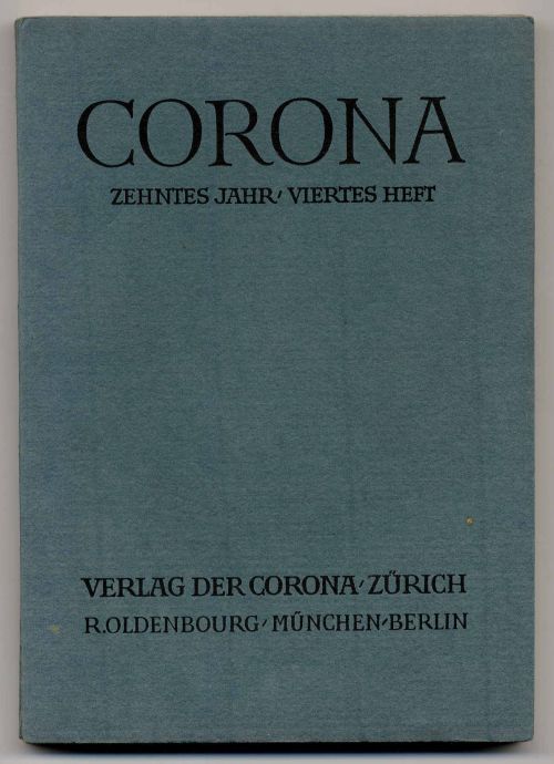 Bodmer, Martin (Hrsg.): Corona. Zehntes Jahr, viertes Heft. München – Berlin, R. Oldenbourg, 1941. Ca. 21 x 15 cm. Grüner originalkartonierter Einband. Corona, literarischen Zweimonatsschrift, die in den Jahren 1930 bis 1943 in München und Zürich erschien. Mit Beiträgen u.a. von Gottfried Bohnenblust, Hermann Hesse, Hofmannsthal, Rudolf Kassner, Julius Overhoff, Selma Lagerlöf.