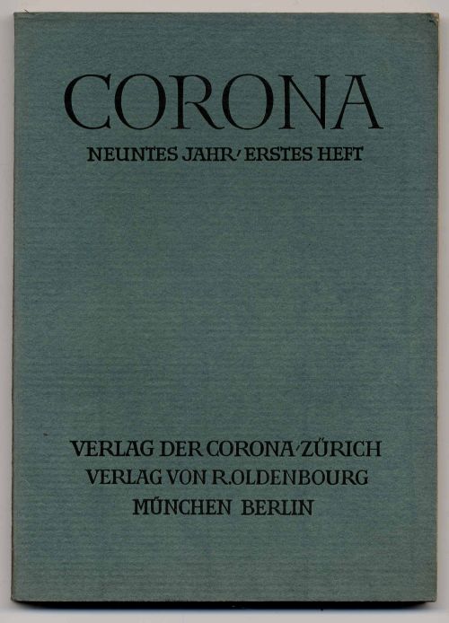 Bodmer, Martin (Hrsg.): Corona. Neuntes Jahr, erstes Heft. München – Berlin, R. Oldenbourg, 1939. Ca. 21 x 15 cm. Grüner originalkartonierter Einband. Corona, literarischen Zweimonatsschrift, die in den Jahren 1930 bis 1943 in München und Zürich erschien. Mit Beiträgen u.a. von Paul Valéry, Emil Strauss, Hermann Hesse, Jacob Burckhardt.