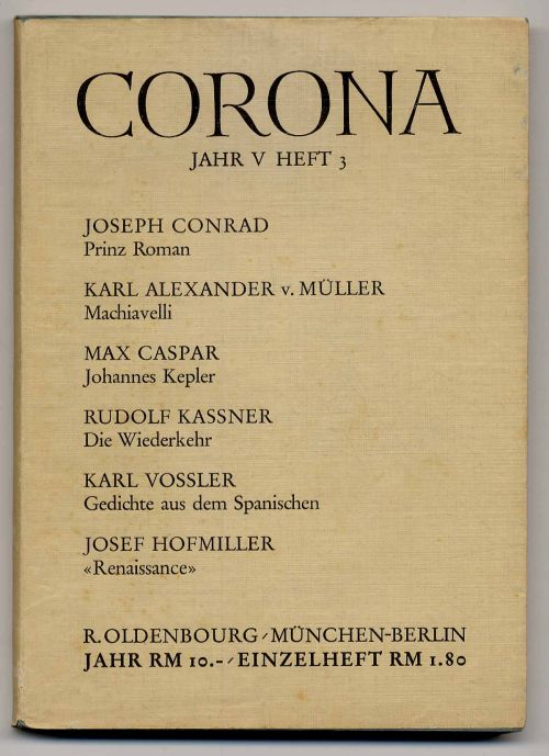 Bodmer, Martin und Herbert Steiner (Hrsg.): Corona. Fünftes Jahr, drittes Heft, März 1935. München – Berlin, R. Oldenbourg, 1935. Ca. 21 x 15 cm. Grüner originalkartonierter Einband mit Schutzumschlag. Corona, literarischen Zweimonatsschrift, die in den Jahren 1930 bis 1943 in München und Zürich erschien. Mit Beiträgen u.a. von Karl Alexander von Müller, Joseph Conrad, Robert Browning, Max Caspar, Josef Hofmiller.