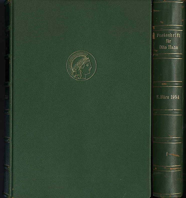 Festschrift für Otto Hahn zum 8. März 1954. 2 Bände. Ohne Ort und Verlag, 1954. Ca. 30 x 21 cm. Band 1 unpaginiert. Band 2: 385 Seiten. Mit zahlreichen Abbildungen und Skizzen. Orig.-Lederbände mit Rückengoldprägung. U.a.: Panet: Das Alter von Eisenmeteoriten; Rudorf: Der augenblickliche Stand und die Aussichten der Züchtung resistenter Sorten der Kartoffel; Schüz: Vom Zug der westsibrisichen Population des Prachttauchers; Witt/Döring: Typuntersuchungen am schwarzbunten Niederungsrind; Betz: Die Entwicklung des Fluggeschwindigkeit; Dieminger: Über die Wirkung solarer Korpuskueln in der Ionosphäre; Menzer: Über Kristallzwillingsgesetze. Einbände leicht berieben. Gutes Set des sehr umfangreichen Werkes mit zahlreichen Beiträgen!