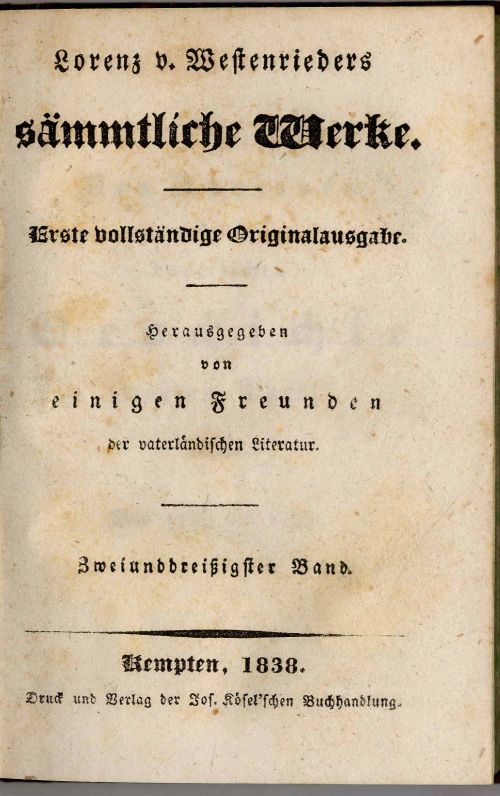 Westenrieder, Lorenz v.: Sämmtliche Werke. 32. Band. Erste vollständige Originalausgabe. Hrsgg. von einigen Freunden der vaterländischen Literatur. Kempten, Jos. Kösel’sche Buchhandlung, 1838. Ca. 13,5 x 9,5 cm. 322 Seiten. Halbleinenband der Zeit mit Rückenblind- und Rückengoldprägung. Einband etwas berieben. Vorsatz mit Stempel. Teils etwas stockfleckig. Hier Band 33 (Abriss der bayerischen Geschichte, zweiter Theil von 1180 bis 1799) der gesammelten Werke des Theologen, Pädagogen, Historikers und Publizisten der Aufklärung Lorenz Westenrieder (1748-1829), der als Wiederentdecker der bayerischen Vorgeschichte und wohl bedeutendster literarischer Aufklärer des katholischen Deutschland gilt.