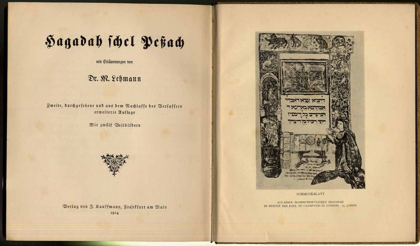 Hagadah schel Peßach. Mit Erläuterungen von M. Lehmann. Zweite, durchgesehene und aus dem Nachlasse des Verfassers erweiterte Auflage. Frankfurt, J. Kauffmann, 1914. Ca. 24,5 x 21 cm. 210 S., (2) Seiten. Mit 12 Tafeln. Orig.-Leinenband. Seiten teils leicht stockfleckig, jedoch guter Zustand. „So möge denn auch diese Ausgabe zur Erhöhung der Stiommung am Sederabend beitragen und Erbauung und Belehrung im jüdischen Familienkreise fördern.“ (Vorwort zu zweiten Auflage).