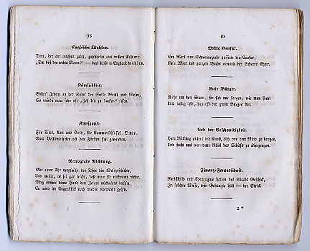 Steinbühl, Justus [d.i. Johann Adam Seuffert]: Epigramme und Sinnsprüche eines Unparteiischen. München, Christian Kaiser, 1848. Ca. 18,5 x 11,5 cm. VI, 220 Seiten. Orig.-Broschur. Etwas fleckig, berieben und bestoßen, Bezugsfehlstellen an den Kapitalen, Name auf Vorderdeckel. Durchgehend etwas braunfleckig.