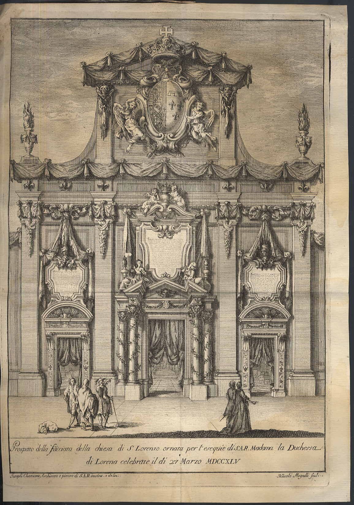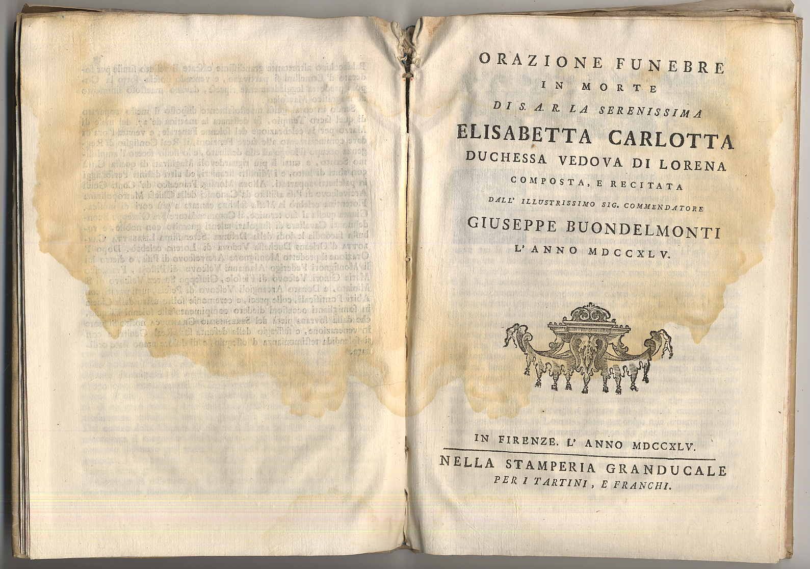 1) Esequie della Serenissima Elisabetta Carlotta d’Orleans Duchessa vedova di Lorena fatte celebrare in Firenze dall’ A.R. del Serenissimo Francesco III. Duca die Lorena e di Bar Granduca di Toscana &c. 2) Orazione funebre in morte di S.A.R. la Serenissima Elisabetta Carlotta Duchessa Vedova die Lorena composta, e recitata dall’ illustrissimo Sig. Commendatore Giuseppe Buondelmonti. Firenze, Granducale, 1745. Ca. 25,5 x 18 cm. 15 Seiten; 12 Seiten. Mit zwei großen, mehrfach gefalteten Kupferstichen von Nicolo Mogalli und Carlo Gregori nach Guiseppe Chamant. Pergamentband der Zeit. Einband und Vorsätze stark fleckig. Seiten durchgehend wasserrandig durch alten Wasserfleck, bei den Tafelabbildungen jedoch kaum sichtbar. Text in italienisch. Begräbnisfeierlichkeiten für Elisabeth Charlotte d’Orléans (1676-1744). Sie war durch Heirat mit Herzog Leopold von 1698 bis 1729 Herzogin von Lothringen und ab 1737 Fürstin von Commercy. Die beiden schönen großen Kupferstiche zeigen die Fassade der Kirche S. Lorenzo mit prächtiger Dekoration sowie den Blick in den für die Feierlichkeiten reich geschmückten Innenraum der Kirche.