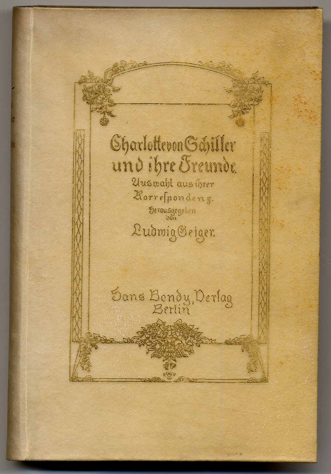 Geiger, Ludwig (Hrsg.): Charlotte von Schiller und ihre Freunde. Auswahl aus ihrer Korrespondenz. Berlin, Hans Bondy, [1908]. Ca. 18 x 12 cm. XLII S., 418 S., (2) Seiten. Originalpergamenteinband mit Goldprägung. Kopfgoldschnitt. Besitzeintrag auf Titelblatt, hinteres Vorsatzblatt mit Resten eines einmontierten Textes, sonst gutes Exemplar.