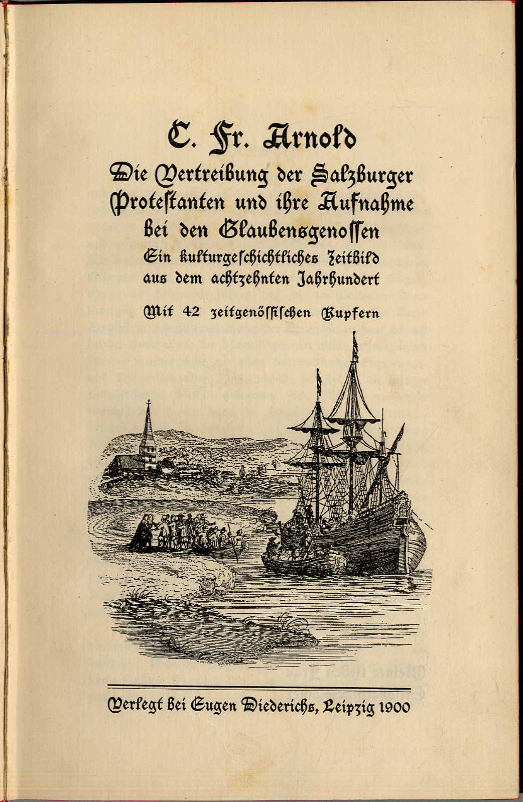 Arnold, C[arl] Fr[anklin]: Die Vertreibung der Salzburger Protestanten und ihre Aufnahme bei den Glaubensgenossen. Ein kulturgeschichtliches Zeitbild aus dem achtzehnten Jahrhundert. Leipzig, Eugen Diederichs, 1900. Ca. 22 x 14 cm. IV S., 246 S., (6) Seiten. Mit Abbildungen nach 42 zeitgenössischen Kupfern, davon 1 mehrfach gefaltete Tafel. Leinenband der Zeit mit Rückenprägung. Einbandkanten leicht berieben, Widmungsvermerk auf Vorsatz. Aus dem Inhalt u.a.: Der Grundcharakter der Salzburger Emigration; Der Salzburger Kirchenstaat; Die Gegenreformation im Erzbistum Salzburg; Das preußische Einladungspatent; Die Wanderung nach Preußen; Die Ansiedlung in Ostpreußen; Emigration nach Holland, Hannover und Amerika.