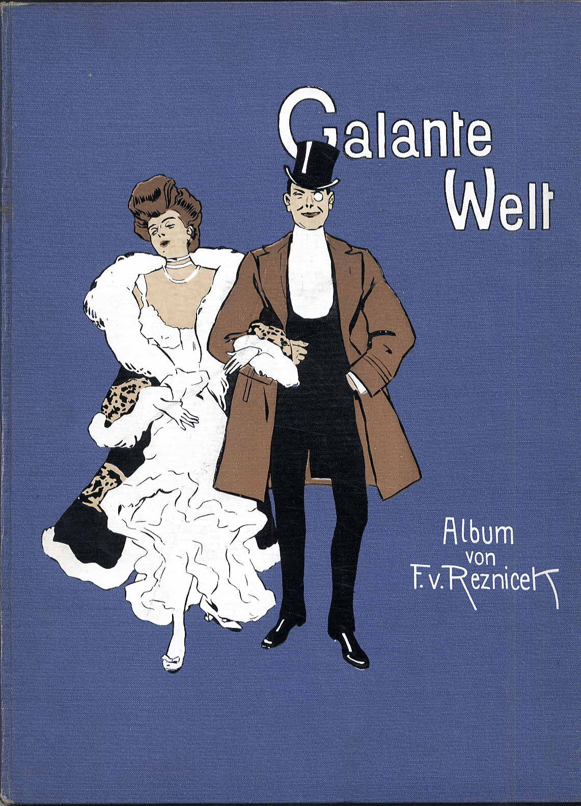 Reznicek, F[erdinand] v.: Galante Welt. Album. München, Albert Langen Verlag für Litteratur und Kunst, 1902. Ca. 40 x 30 cm. (4) S., 30 farbige Illustrationen auf Tafeln. Farbig illustr. blauer Orig.-Leinenband. Rücken leicht berieben. Mit prächtigen Zeichnungen des Simpliccimus-Illustrator Reznicek. Sehr dekorativer Einband.