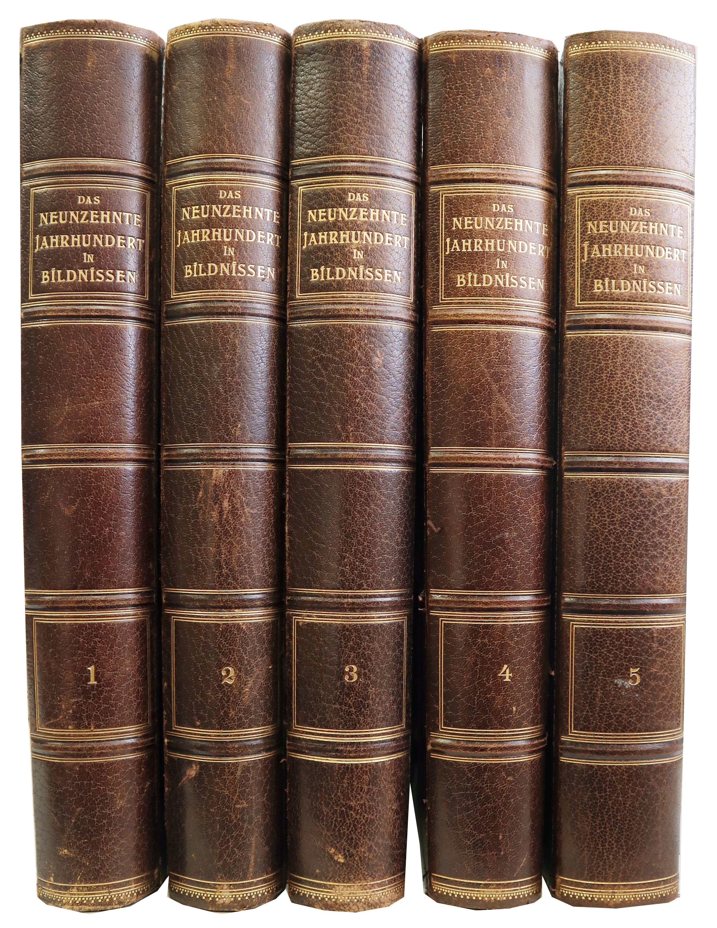 Werckmeister, Karl (Hrsg.): Das neunzehnte Jahrhundert in Bildnissen. 5 Bände. Berlin, Kunstverlag der photographischen Gesellschaft, 1898-1901. Ca. 36 x 27,5 cm. Reich iullustriert. Orig.-Halblederbände mit Rückengoldprägung. Einbandkanten teils bestoßen und Leder etwas beschabt. Portraits u. Biographien berühmter Persönlichkeiten aus sämtlichen Bereichen der Kunst, Kultur, Musik, Literatur, Philosophie, Politik u. Naturwissenschaften des 19. Jahrhundert, mit zum Teil frühen photographischen Abbildungen.