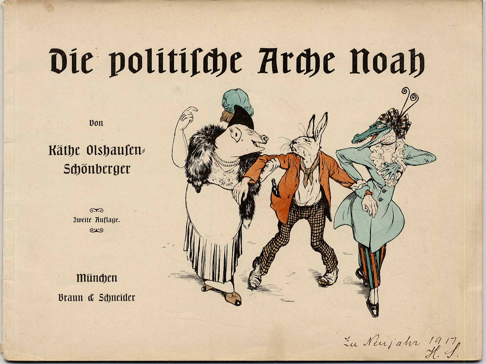 Olshausen-Schönberger, Käthe: Die politische Arche Noah. 2. Auflage. München, Braun & Schneider Vlg., ca. 1916. Querformat, ca. 17,5 x 23 cm. 28 Seiten mit 26 ganzseitigen Illustrationen. Farbig illustr. Orig.-Broschur. Olshausen-Schönberger (1881-1968), kommentiert mit ihren hervorragenden Tier-Karikaturen die gesellschaftspolitischen Entwicklungen in Europa von 1914 bis 1916. Rücken minimal bestoßen, Einband mit kleiner handschriftlicher Widmung.