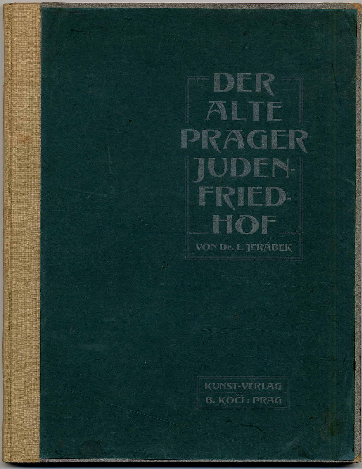 Jerábek, L[ubomír]: Der alte Prager Judenfriedhof. Mit Beiträgen von J. Pollak. Prag, Kunstverlag B. Kocí, (1903). Ca.31,5 x 25 cm. 47 S., (3) Seiten, mit farbigem Titelbild und 22 ganzseitigen s/w Abbildungen. Späterer Halbleinenband mit aufgezogenem Originalvorderdeckel. Widmung auf Vorsatz. Gutes Exemplar.