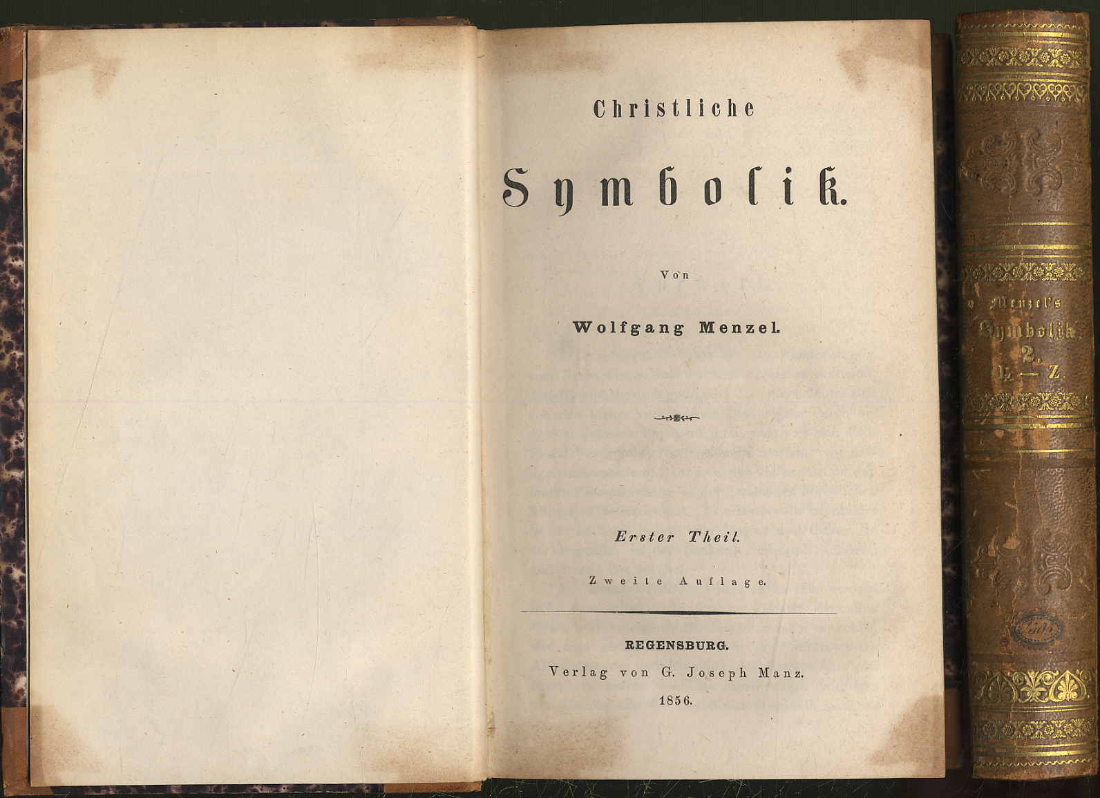Menzel, Wolfgang: Christliche Symbolik. 1. und 2. Theil. 2. Auflage. Regensburg, G. Joseph Manz, 1856. Ca. 21 x 13 cm. XII, 540 Seiten; 585 S., (3) Seiten. Halblederbände der Zeit mit Rückengoldprägung. Alphabetisch geordnetes Handbuch, mit teils ausführlich erläuterten Stichworten, z.B. Aas, Adam, Abendmahl, Blumen, Blind, Büchse, Engel, Glocken, Harfe, Jerusalem, Kerze, Kristall, Kühe, Labyrinth, Licht, Monate, Mond, Öl, St. Petrus, Propheten, Regenbogen, Ritter, Schlange, Taube, Tod, Veilchen, Walfisch, Wasser, Wein, Wurm u.v.a. Vorsätze etwas gebräunt. Rücken und Kanten etwas beschabt. Gutes Exemplar.