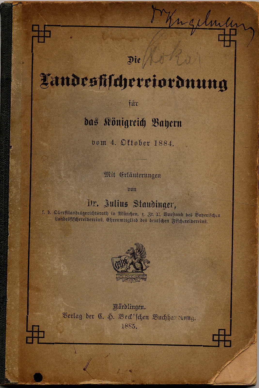 Staudinger, Julius: Die Landesfischereiordnung für das Königreich Bayern vom 4. Oktober 1884. Nördlingen, C.H. Beck’sche Buchhdlg., 1885. Ca. 18 x 12,5 cm. IV S., 1 Bl., 170 Seiten. Orig.-Halbleinenband. Einband mit Schriftzug, gebräunt, etwas fleckig und mit Eckabrissen. Fadenheftung gelockert. Aus dem Inhalt u.a.: Geschichtliche Entwicklung der fischereipolizeilichen Vorschriften in Bayern; Die Landesfischereiordnung nach Wortlaut und Bedeutung; Die strafrechtlichen Folgen von fischereipolizeilichen Verfehlungen.