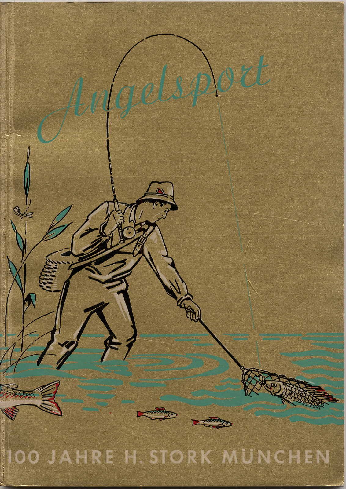 Stork – Angelsport. Anglergeräte-Katalog Jubiläumsausgabe. H. Stork, München. München, 1957. Ca. 22 x 15,5 cm. 136 Seiten. Mit zahlreichen s/w-Abbildungen und 3 farbigen Tafeln mit Kunstfliegen. Farbig illustrierter Orig.-Karton. Verkaufskatalog mit Preisen zum 100jährigen Jubiläum. Gutes Exemplar. Wichtiges Nachschlagewerk für alle Sammler von alten Angelgeräten.