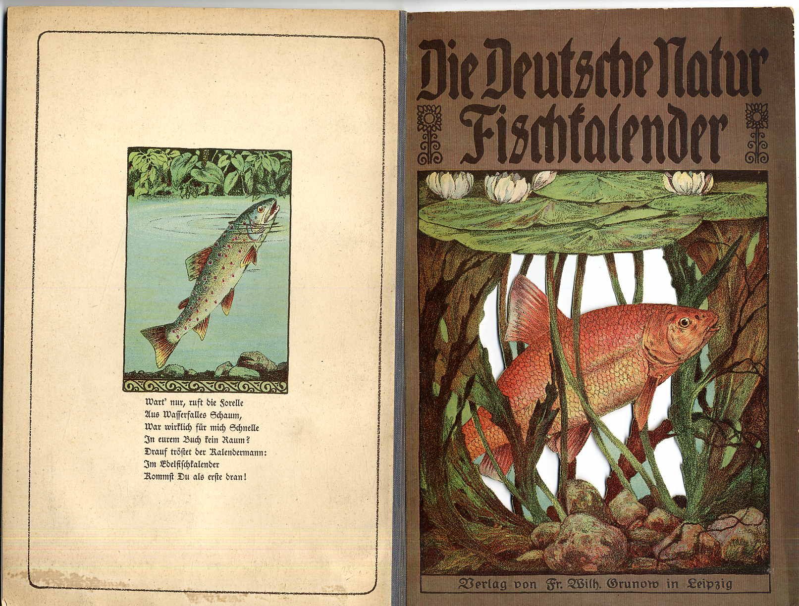 Fechner, Hanns und Carl Paeske: Fischkalender. 1. Teil: Fische unserer Flüsse und Seen. Leipzig, Fr. Wilh. Grunow, [1908]. Ca. 29 x 19,5 cm. (28 Seiten). Mit Farblithographien nach Zeichnungen von Berthold Clauß. Farbig illustrierter, lithographierter, ausgestanzerter Orig.-Halbleinenband. Originalhalbleinwandeinband mit ausgestanzten Teilen (Fisch, Seerosen) am Vorderdeckel. Einbandkanten minimal bestoßen, Hinterdeckel am unteren Rand etwas fleckig. Sehr dekorativer Kalender der zu jedem Monat eine Fischart mit ausführlicher Beschreibung zeigt. Gutes Exemplar.