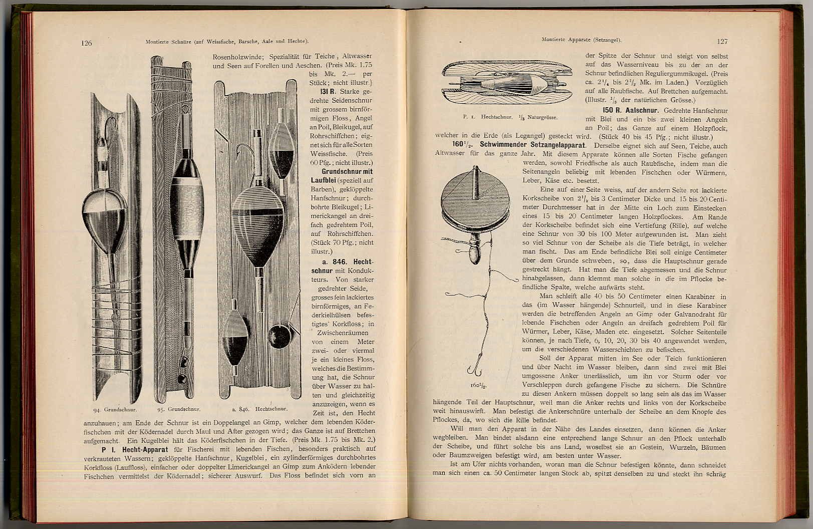 Angelsport – Stork, H[ermann]: Der Angelsport. Das Wissenswerteste aus demselben nebst Anleitungen zum Gebrauch der Angelgeräte sowie Beschreibung der verschiedensten Angelmethoden besonders der Flugangel, der Grundangel, der Spinnangel und der Schleppangel. Als Anhang: Angler-Fahrten. Dr. Victor von Scheffel als Angler. Diverse Erlebnisse auf Angelexkursionen u.s.w. In 10 Erzählungen. München, Selbstverlag des Verfassers, o.J., um 1895. Ca. 26,5 x 20 cm. III S., 307 S., VI S. Mit über 1.000 Abbildungen. Illustlrierter grüner Orig.-Leinenband. Mit Exlibris. Deckeltitel: „Der Angelsport. Freunden des Angelsports ein gewissenhafter Ratgeber.“ U.a.: Angelruten, Haspel, Rollen, Winden, Angelschnüre, Vorfächer, Angeln, das Floss, die künstlichen Fliegen, Metallspinner, Gummispinner, Angelnecessairs, Senkblei, Wirbel, Seidenwurmdarm, Wurm- und Insektenbehälter, Fischtransportkessel, Fischnetze, Fischzucht und Madenerzeugungsapparat, Angelmethoden, Fang der Forelle, Fang der Seeforelle, des Huchens, des Lachs, des Saibling, der Aesche, Fang des Hechtes, des Zander, Fang von Friedfischen, des Barsches, der Barbe, des Karpfens, des Aitels, des Aals, des Wallers, des Krebses. Anglerfahrten, u.a. Victor von Scheffel als Angler; Französische Angler. Gutes Exemplar.