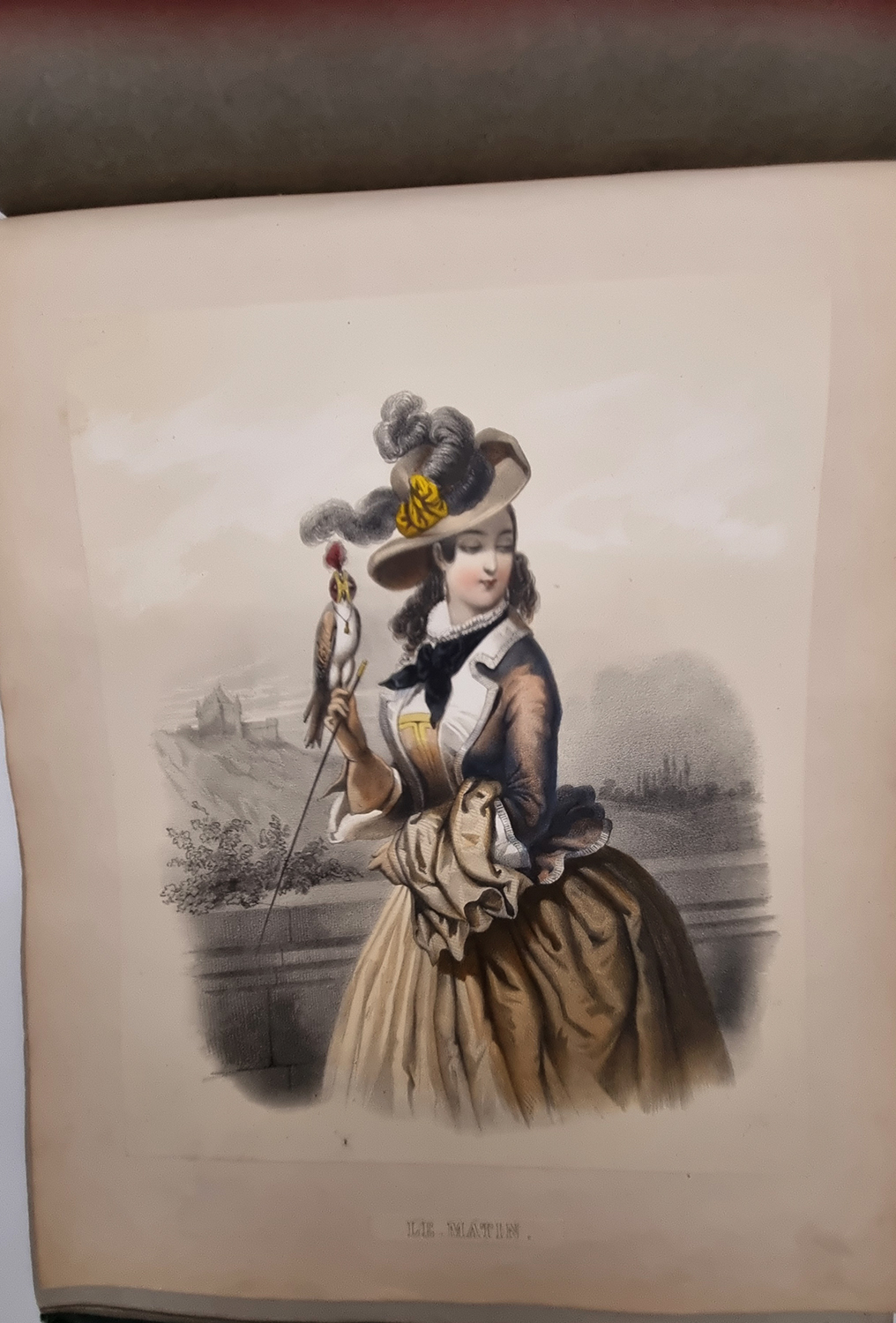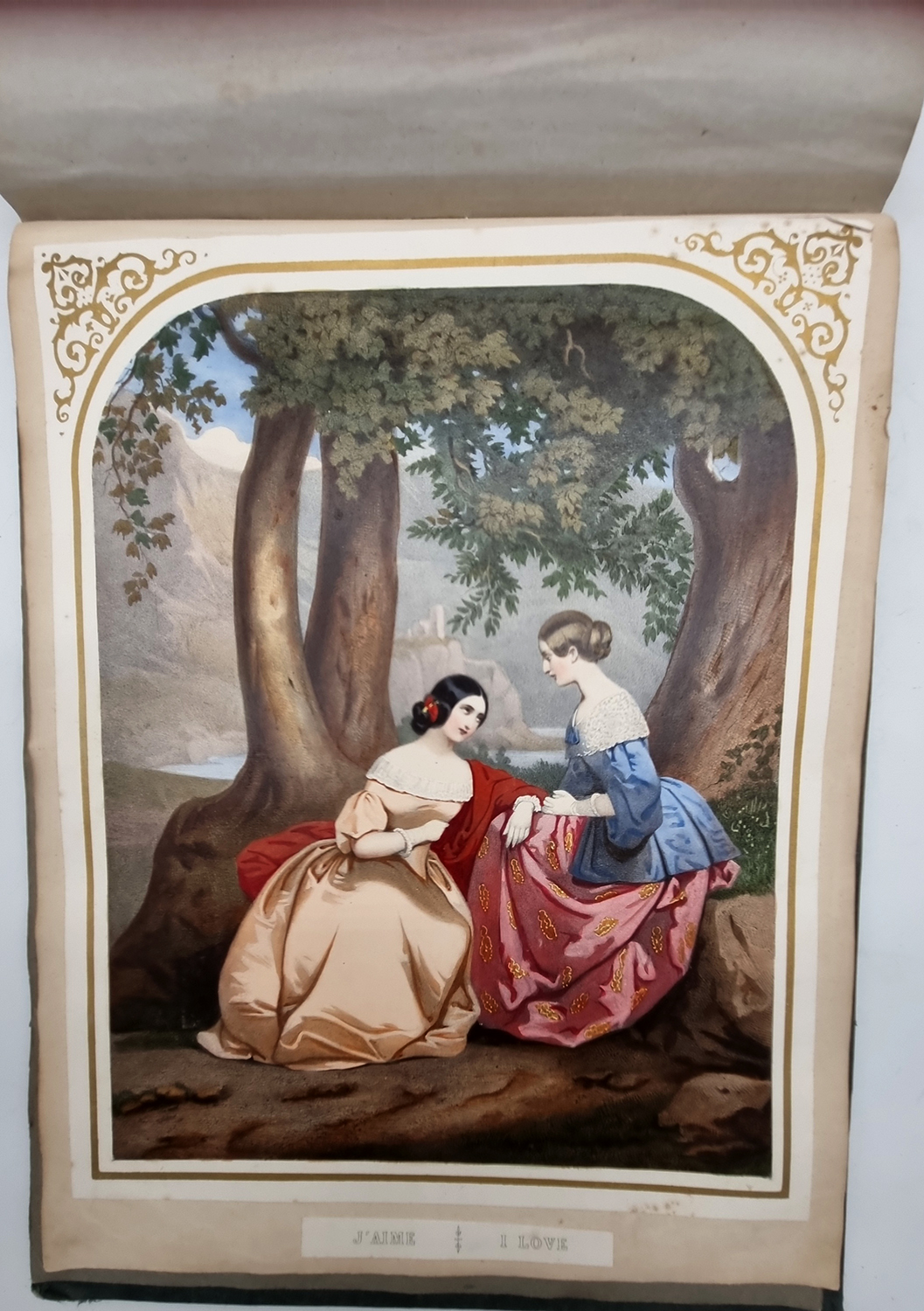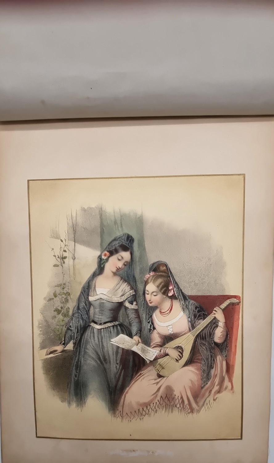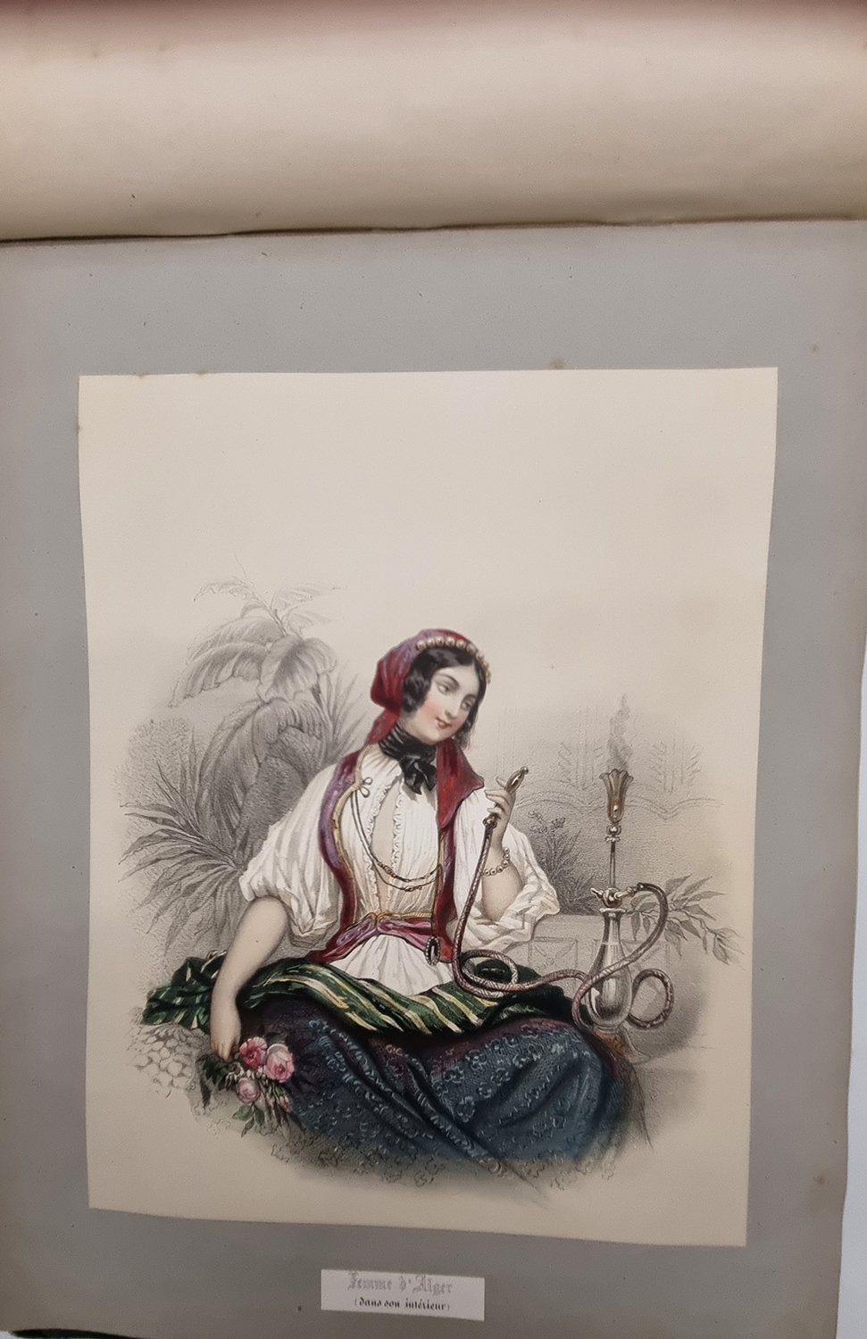 Frauen – Sammelalbum mit 60 großen und 4 kleinen Lithographien mit Frauendarstellungen, teils handcoloriert, teils farblithographiert, einige Chromolithographien. Ca. 1850er Jahre. Querformat, ca. 26 x 34 cm. Leineneinband mit Gold- und Blindprägung, mit Goldschnitt. U.a. mit 7 Lithographien von Auguste Bovier (ca. 1827-1881): Le Voile, La Musique, Le Perroquet, L’Ecrin, La Sultane, Les Poissons d’Or, Le Récit, Le Miroir; Lithographien von Joseph Bettanier (1817-1877): Cécily; Juive d’Alger en promenade; Sultane du Maroc – en promenade; Weitere Abbildungen u.a. bezeichnet als: Fatme – Persanne; Ines – Espagnol; Vasiliki Albanaise; Scheherezade (Turque); Daja – L’Indienne; Yanki – Chinoise; Le Travail; Le Gouter; La Toilette; Le Lever; La Chasse; La Presentation Louis XIV; La Rosiere Louis XV; Noblesse; Le Bain; Femme de Constantine – costume de Féte, Femme d’Alger – dans sou interieur; L’eau; Le feu; La terre; L’automne; Le printemps; L’Afrique; L’Amerique; L’Asie; Le matin; Le soir; Maichande de Ruban; M. de Joujoux; Parfumeuse, Patissiére; Haydée; Mercédés; Mme. de Villefort; Valentine; La comtesse Mac Grégor; J’aime – I love; Elle aimera – she will love; Aimante – loving; J’ai aimé – I have loved; Elle aimait – she did love; Die vier kleinen Lithographien (ca. 13 cm) zeigen Berthe, Hildegunde, Odette, Marguerite; Die Lithographien teils oval, teils rechteckig, Höhe meist ca. 25 cm, fest auf etwas dickerem Papier montiert, die Bildtitel teils unten mit anmontiert (jedoch ohne Künstlerangaben). Ein Blatt mit Fehlstelle im Trägerpapier, ein Blatt mit Einriss (jedoch ohne Beeinträchtigung der Abbildungen). Feine und sehr reizvolle seltene Lithographien mit Frauendarstellungen.