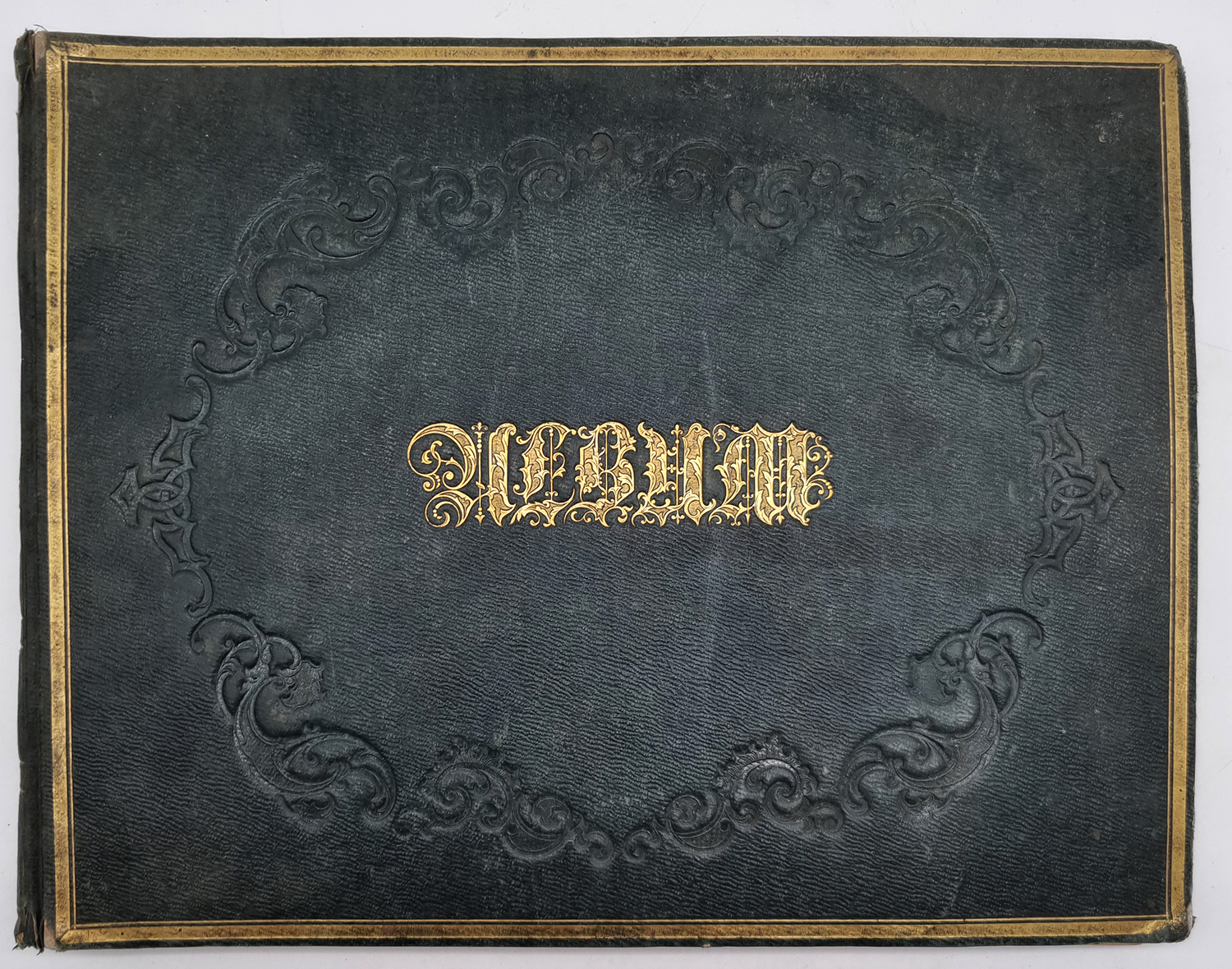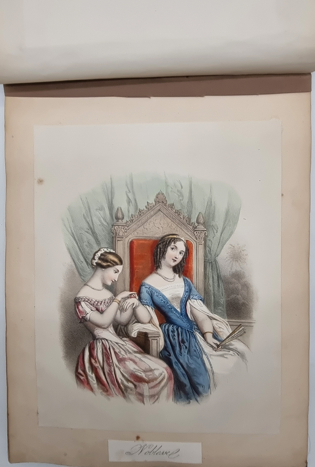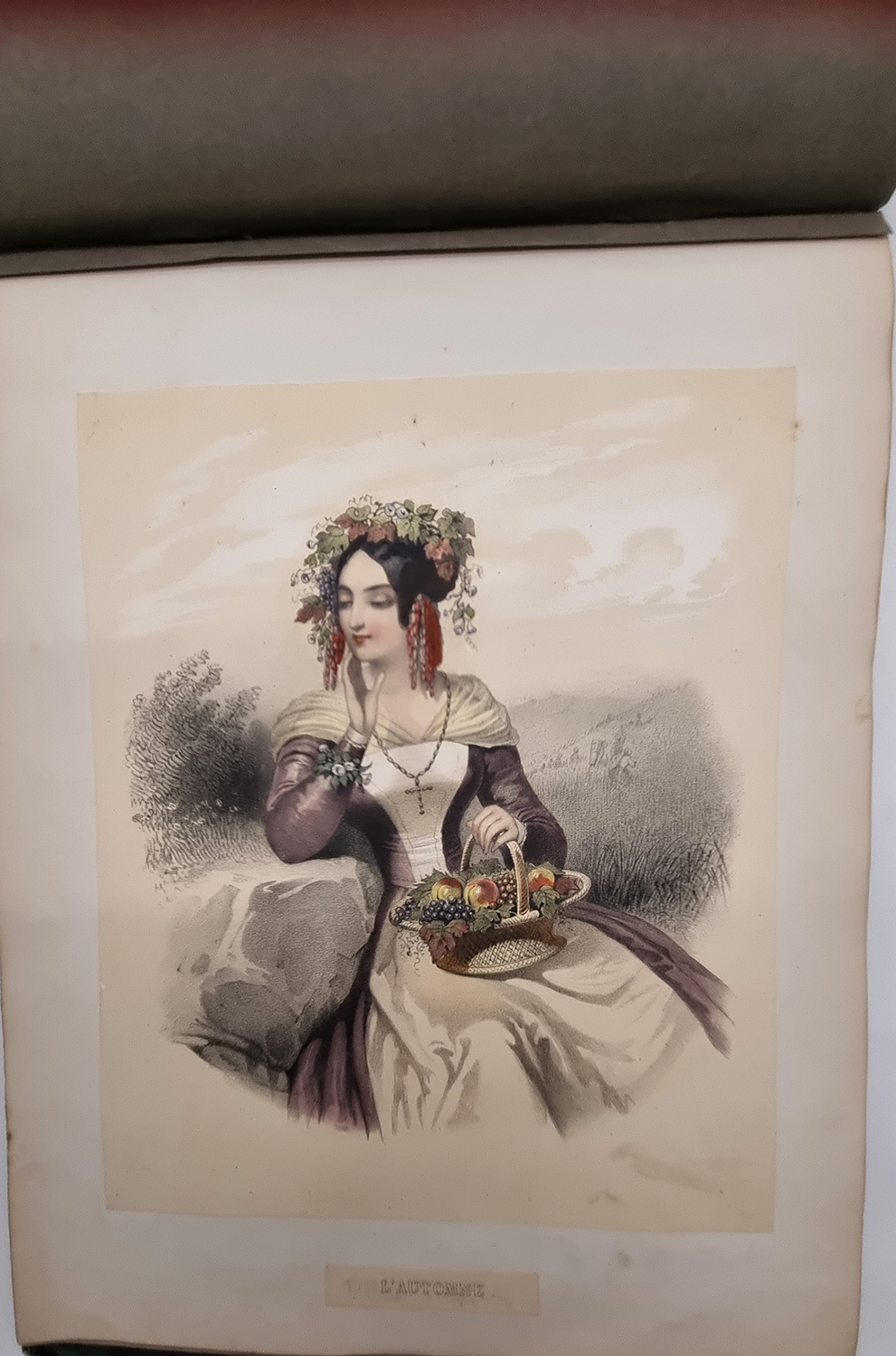 Frauen – Sammelalbum mit 60 großen und 4 kleinen Lithographien mit Frauendarstellungen, teils handcoloriert, teils farblithographiert, einige Chromolithographien. Ca. 1850er Jahre. Querformat, ca. 26 x 34 cm. Leineneinband mit Gold- und Blindprägung, mit Goldschnitt. U.a. mit 7 Lithographien von Auguste Bovier (ca. 1827-1881): Le Voile, La Musique, Le Perroquet, L’Ecrin, La Sultane, Les Poissons d’Or, Le Récit, Le Miroir; Lithographien von Joseph Bettanier (1817-1877): Cécily; Juive d’Alger en promenade; Sultane du Maroc – en promenade; Weitere Abbildungen u.a. bezeichnet als: Fatme – Persanne; Ines – Espagnol; Vasiliki Albanaise; Scheherezade (Turque); Daja – L’Indienne; Yanki – Chinoise; Le Travail; Le Gouter; La Toilette; Le Lever; La Chasse; La Presentation Louis XIV; La Rosiere Louis XV; Noblesse; Le Bain; Femme de Constantine – costume de Féte, Femme d’Alger – dans sou interieur; L’eau; Le feu; La terre; L’automne; Le printemps; L’Afrique; L’Amerique; L’Asie; Le matin; Le soir; Maichande de Ruban; M. de Joujoux; Parfumeuse, Patissiére; Haydée; Mercédés; Mme. de Villefort; Valentine; La comtesse Mac Grégor; J’aime – I love; Elle aimera – she will love; Aimante – loving; J’ai aimé – I have loved; Elle aimait – she did love; Die vier kleinen Lithographien (ca. 13 cm) zeigen Berthe, Hildegunde, Odette, Marguerite; Die Lithographien teils oval, teils rechteckig, Höhe meist ca. 25 cm, fest auf etwas dickerem Papier montiert, die Bildtitel teils unten mit anmontiert (jedoch ohne Künstlerangaben). Ein Blatt mit Fehlstelle im Trägerpapier, ein Blatt mit Einriss (jedoch ohne Beeinträchtigung der Abbildungen). Feine und sehr reizvolle seltene Lithographien mit Frauendarstellungen.